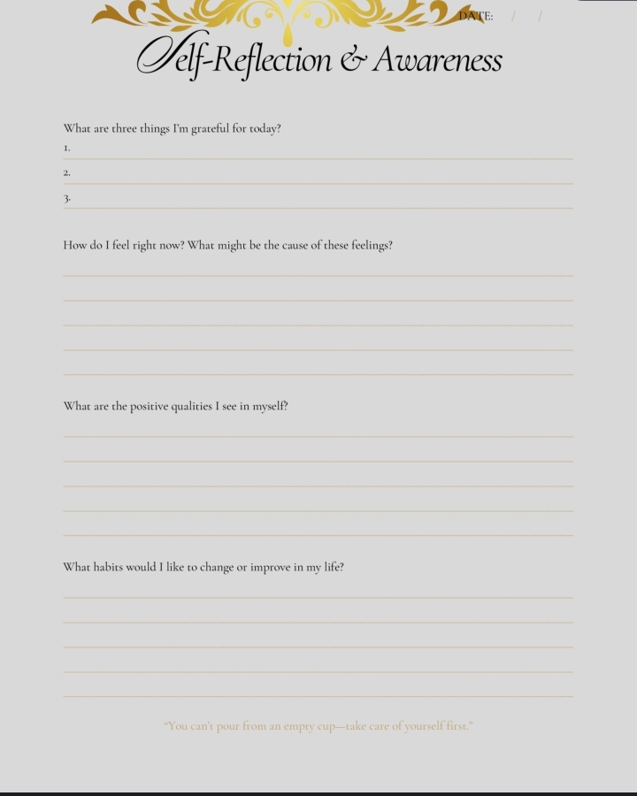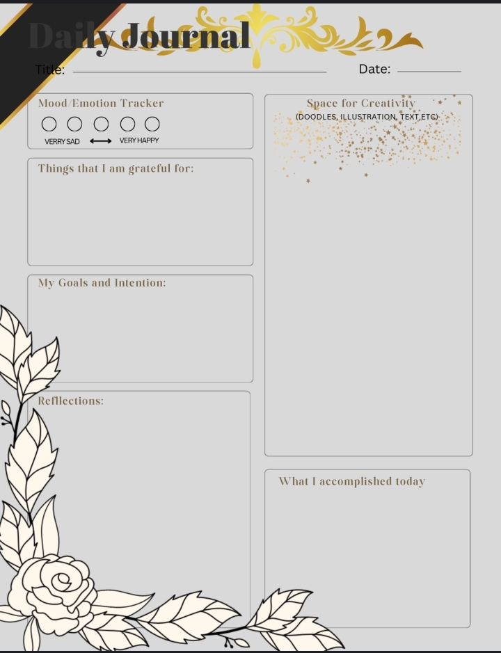 > Elevate your journaling with Golden Reflections, a luxe black & gold printable personal journal. Elegant pages for reflection, gratitude, goal-setting, and self-discovery. Printable PDF — perfect for personal use or gifting.
