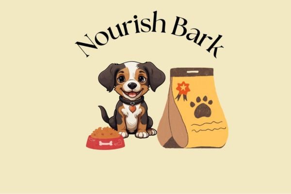 This logo for a dog food brand features a cheerful yellow background, symbolizing energy, warmth, and happiness, qualities every healthy and nourished dog exudes. At the center sits a playful dog in a petting position, capturing trust and care. Flanking the dog is a bag of dog food, reinforcing the brand's purpose and focus. Bold letters spelling out “Nourish Bark” stand prominently, reflecting strength, reliability, and the promise of premium nourishment for pets. The overall design is vibrant and inviting, appealing to pet owners seeking quality and love for their furry friends.