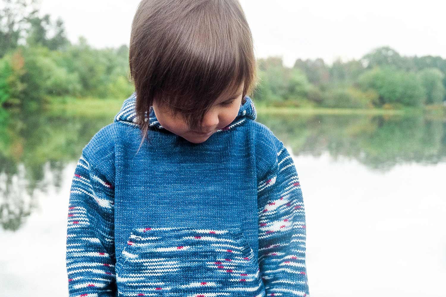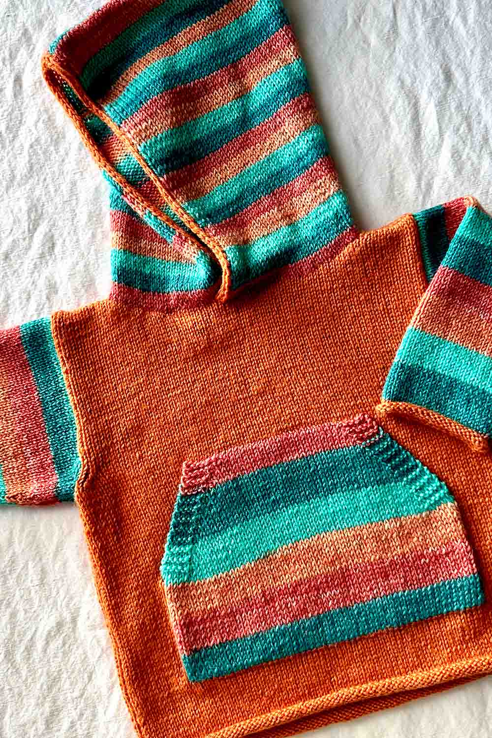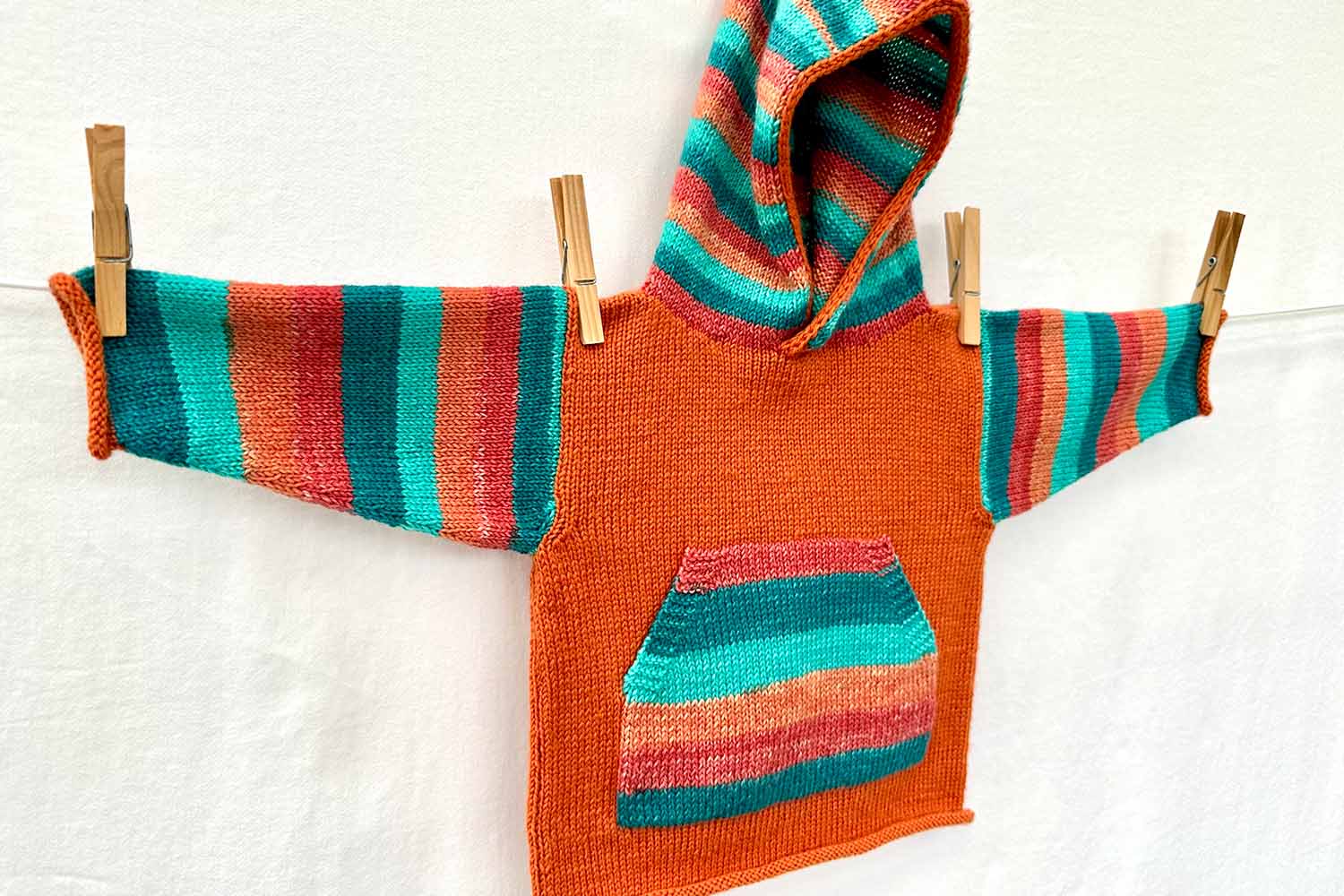 A kid couldn’t have a more wearable pullover than a kangaroo pocket hoodie! Everyone from babies to big kids will love this relaxed sweater, with space to warm hands and hold treasures, and colourful stripes to add fun. A contrast rectangle on the back, rolled contrast cuffs and applied I-cord take this hoodie from plain to perfect.