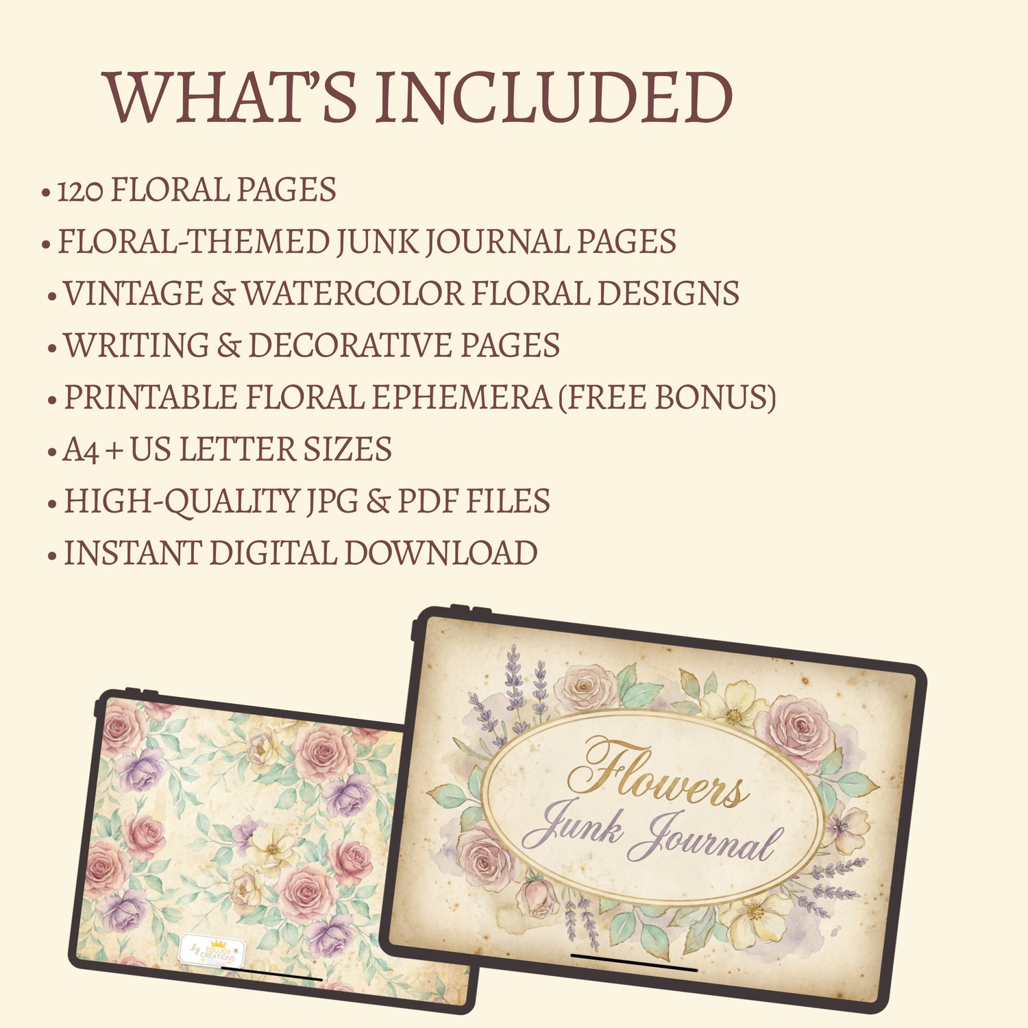 This digital Floral Junk Journal includes 120 carefully designed floral pages, perfect for: