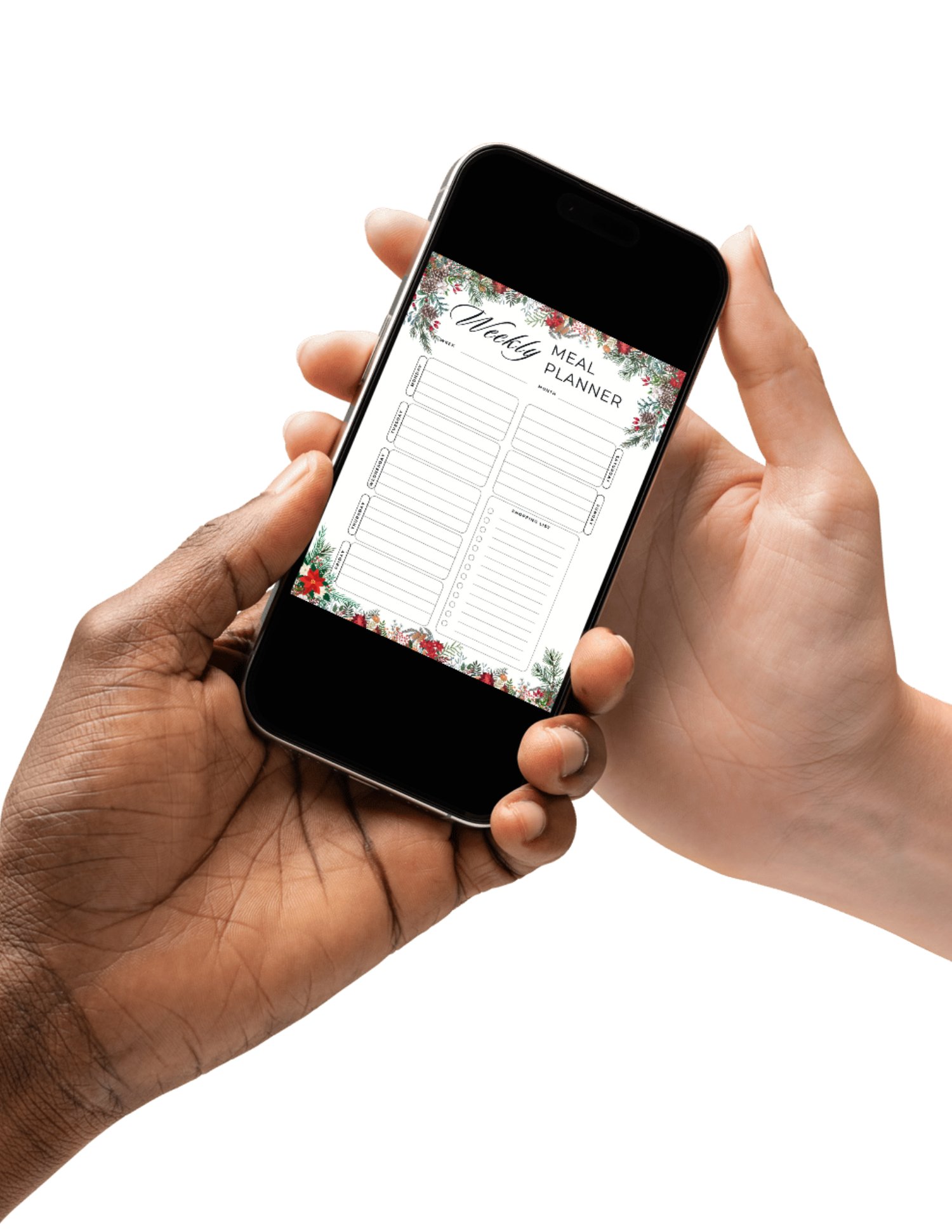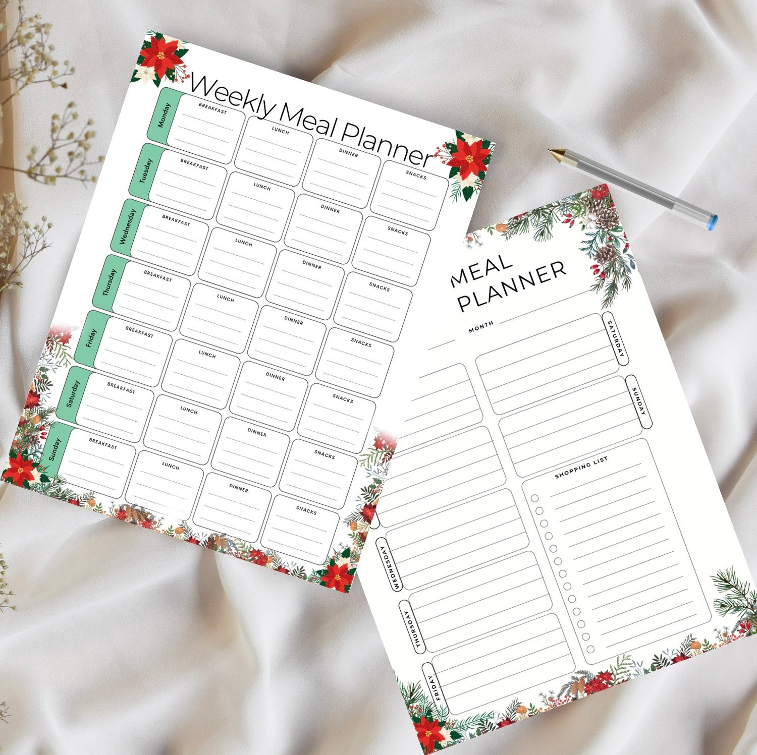 Make mealtime merry and organized this season with this beautifully designed Holiday Weekly Meal Planner. Featuring soft winter greens and poinsettia accents, this printable planner helps you stay on top of your meals, shopping, and holiday hosting with ease.