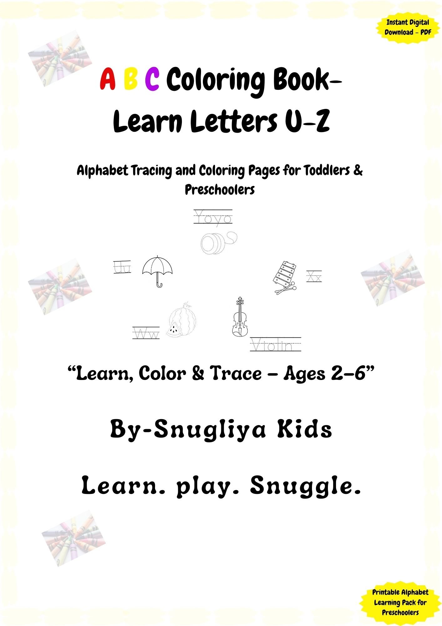 Help your little learner explore the last six letters of the alphabet with this fun and educational U–Z Coloring & Tracing Book by Snugliya Kids!