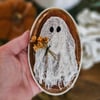 Vintage inspired mini ghost is made from cheesecloth and adhered to a painted and distressed white wood plaque. Measures 5x3. Features a bundle of dried hill flowers.