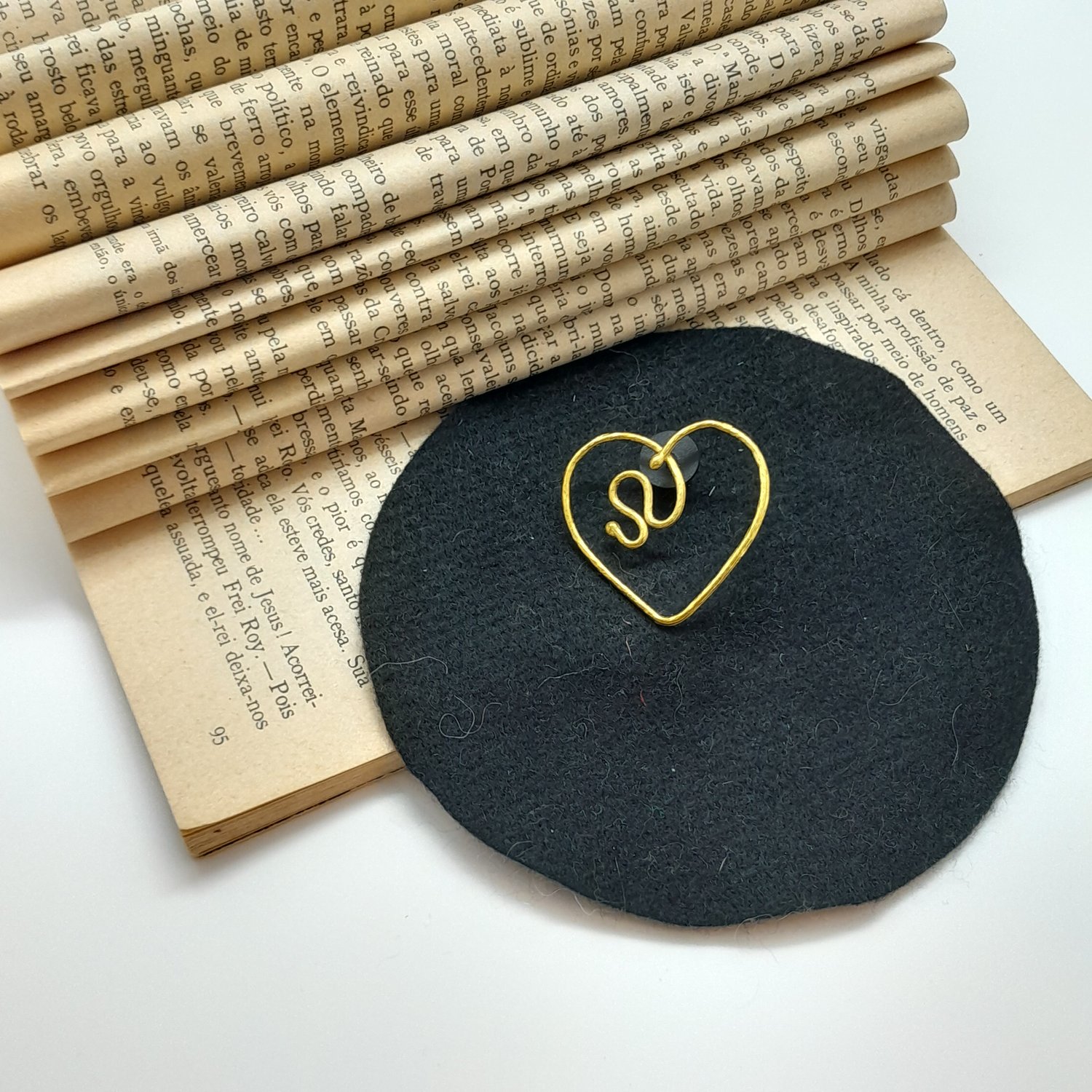 Portuguese style knitting requires a specific way of manipulating the thread in order to maintain a constant tension at work. In this technique, using a shoulder pin is one of the ways traditionally used. This pin reinterprets this functionality through the timeless shape of a heart where it can pass the knitting wire through the inner loop of the heart. Its shape and design also allows the versatility of using it throughout the day as a stylish and discreet accessory when not knitting.