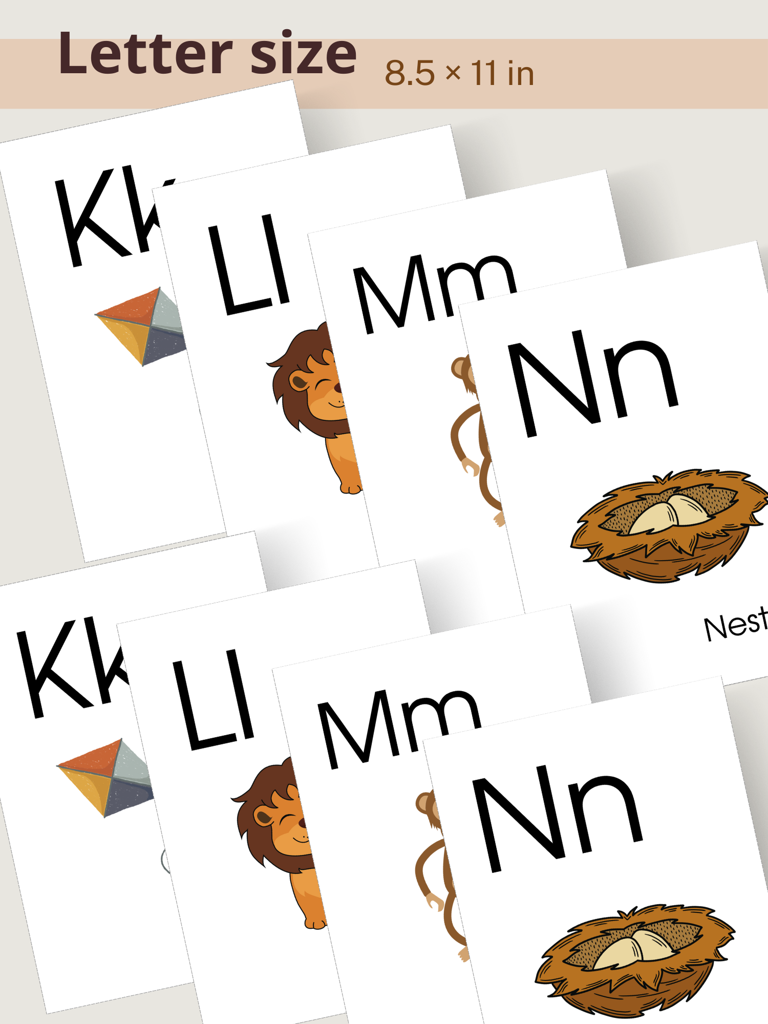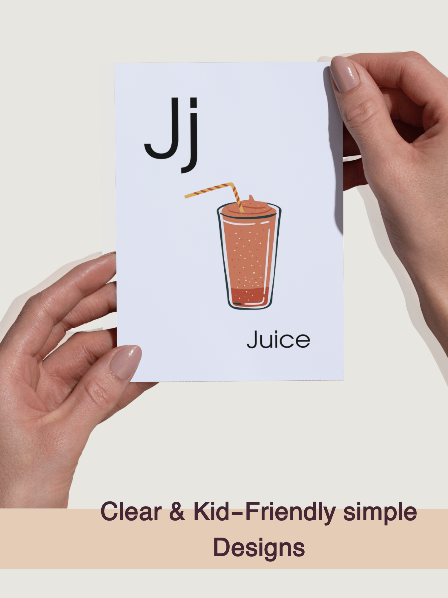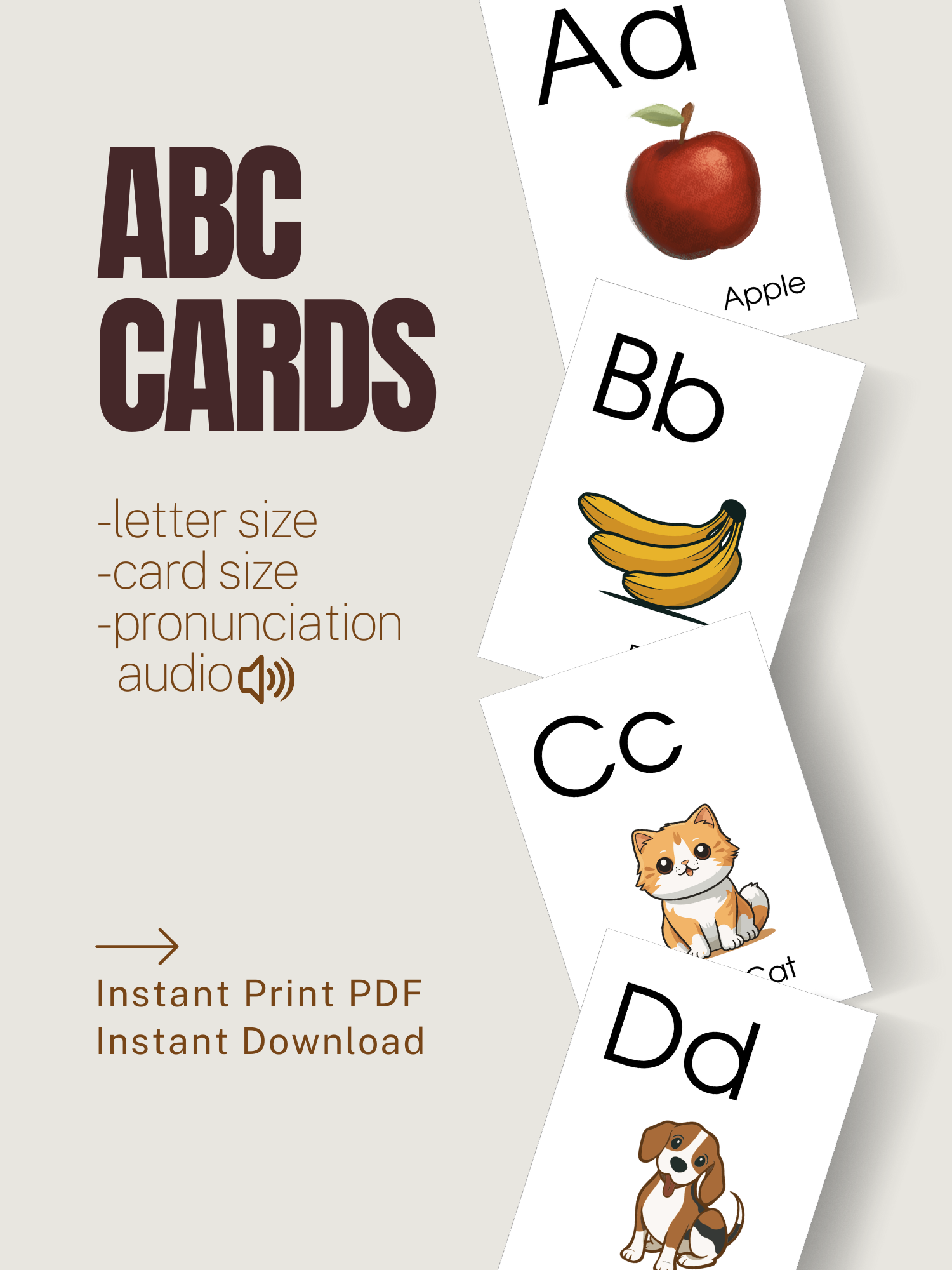 These printable English alphabet flashcards come with audio pronunciation files so your child can hear each letter and word spoken clearly. Perfect for parents, teachers, and homeschool activities.