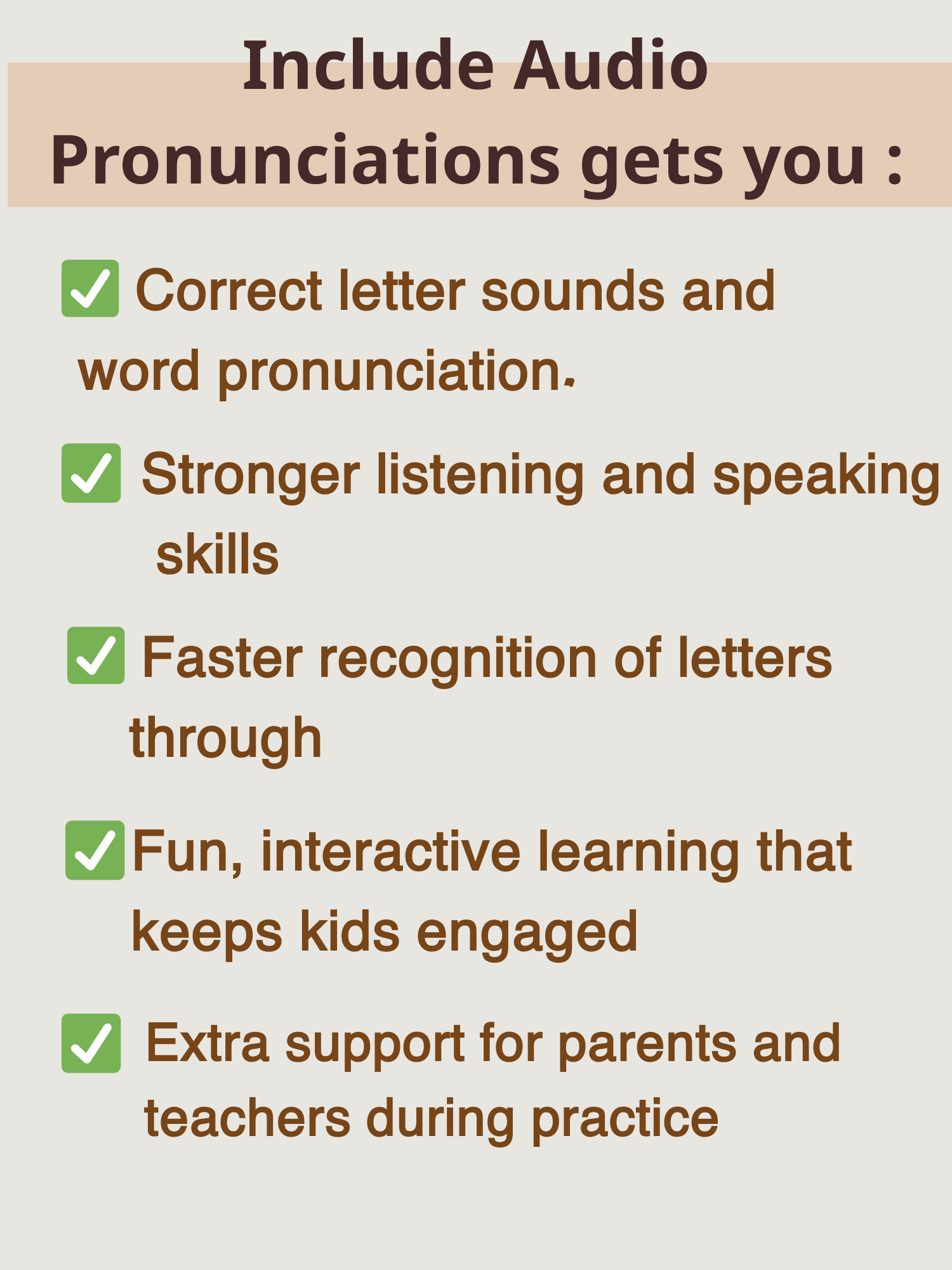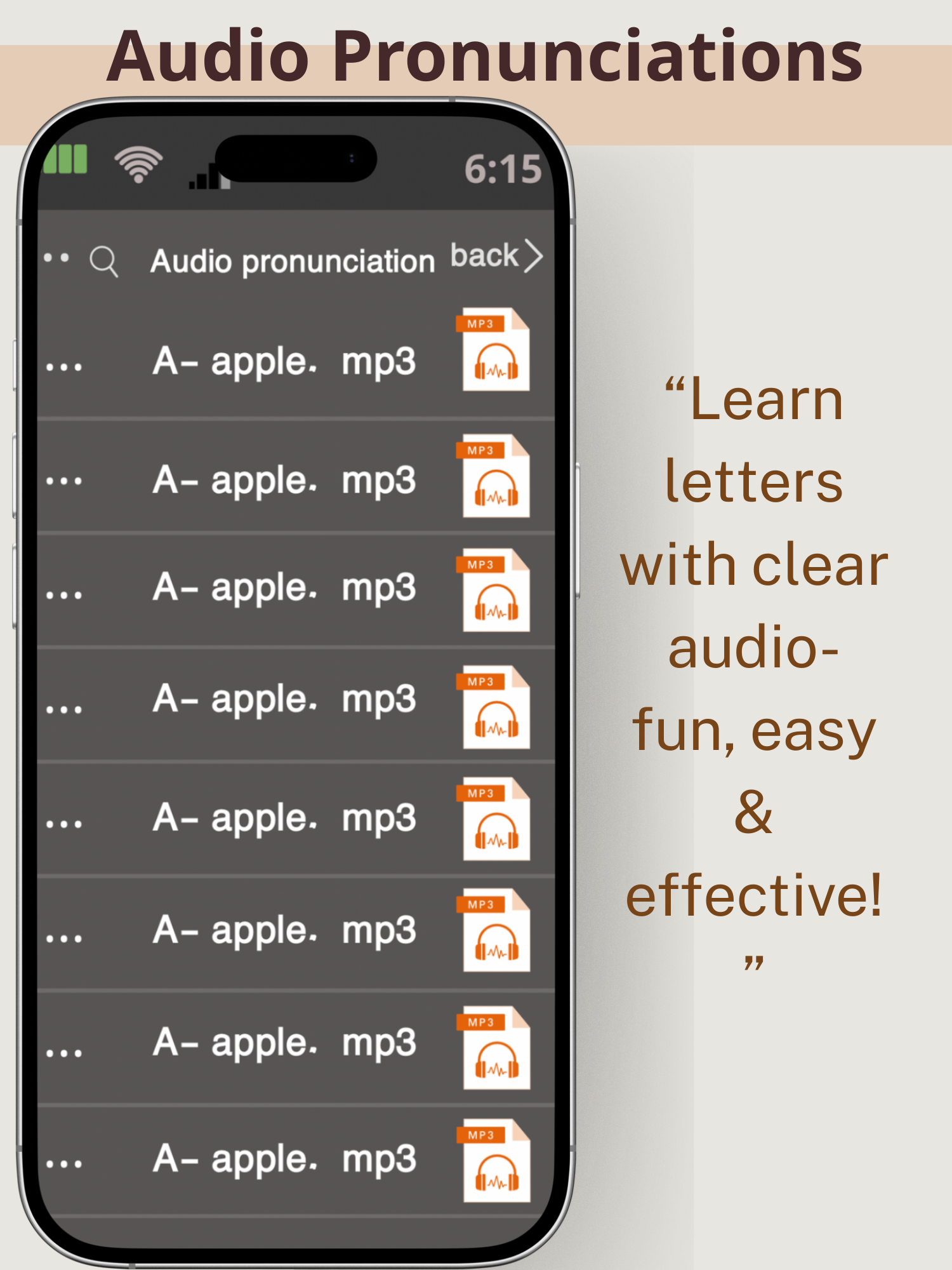 - Audio pronunciation files for every letter and word (e.g., A – Apple).