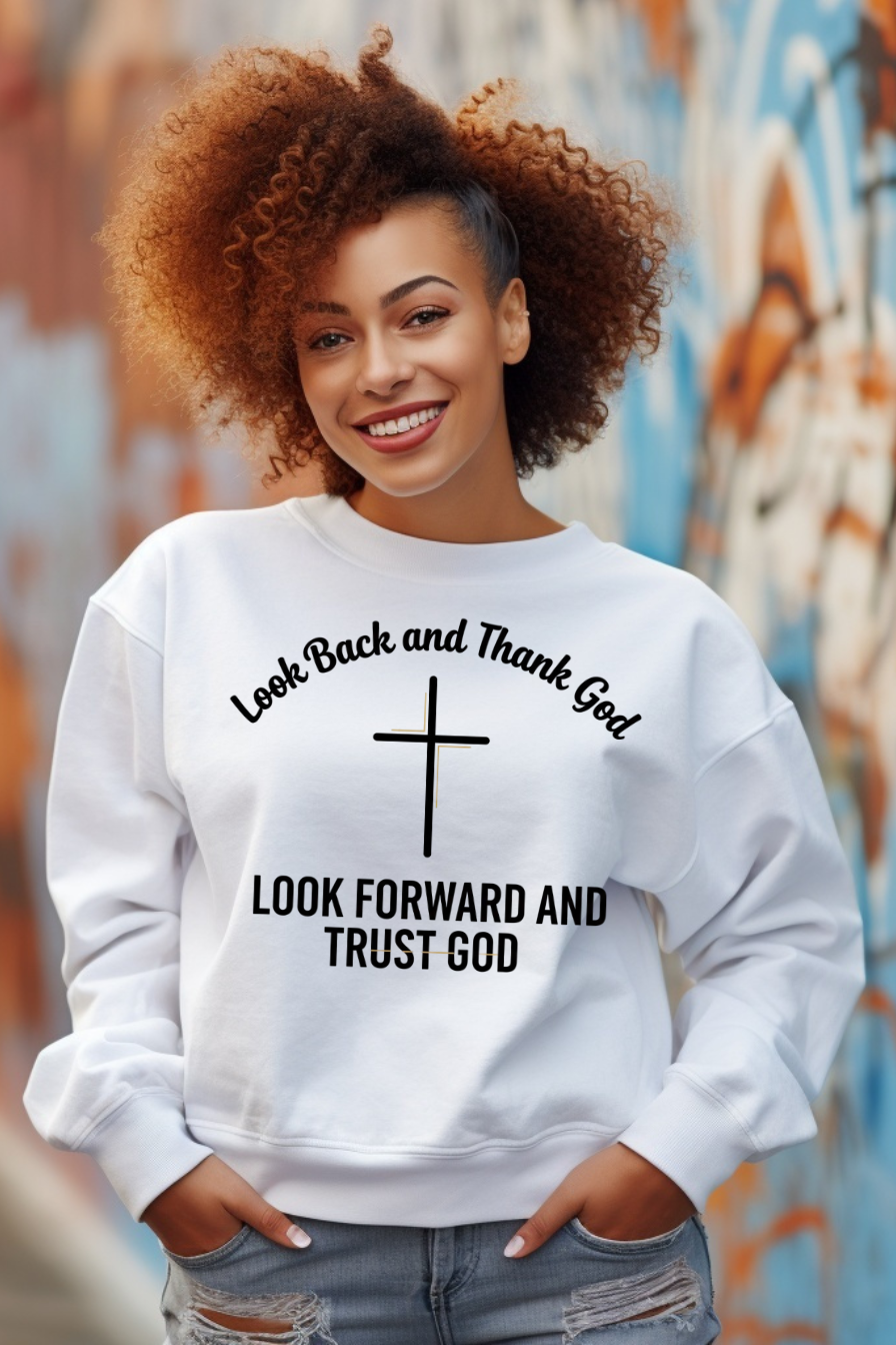 This “Look Back and Thank God, Look Forward and Trust God” design features a clean minimalist layout with a centered cross, making it perfect for modern Christian apparel and faith-based creations.