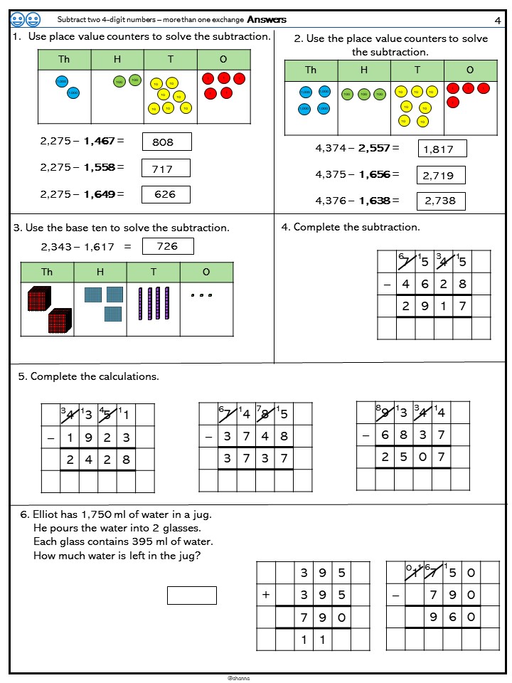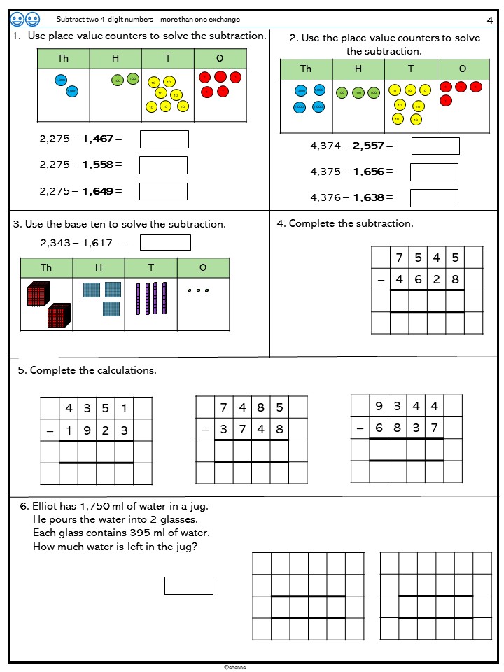 In these worksheets, children subtract up to 4-digit numbers with more than one exchange, using the written method of column subtraction. Children perform subtractions involving two separate exchanges