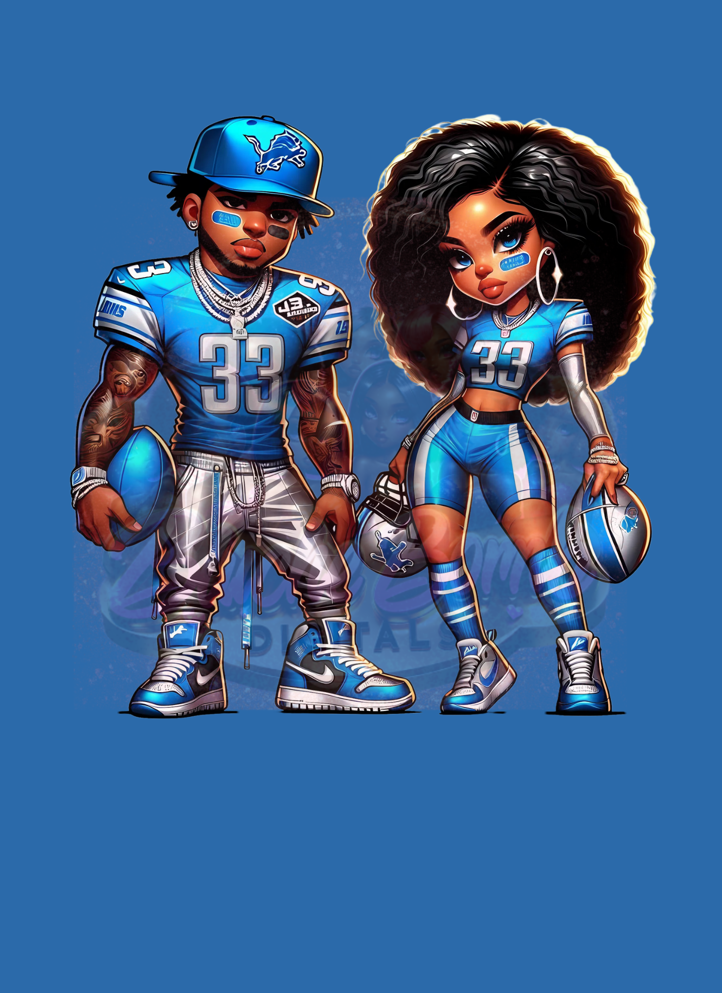 Show off your team spirit with this Detroit football-inspired digital artwork featuring a stylish cartoon couple in bold blue and silver jerseys. This eye-catching design is perfect for game day décor, gifts, apparel, posters, and more!