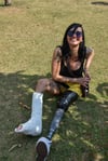 As she is sitting at the entrance, everyone looks and observes her beautiful prosthesis and cast on the other foot.