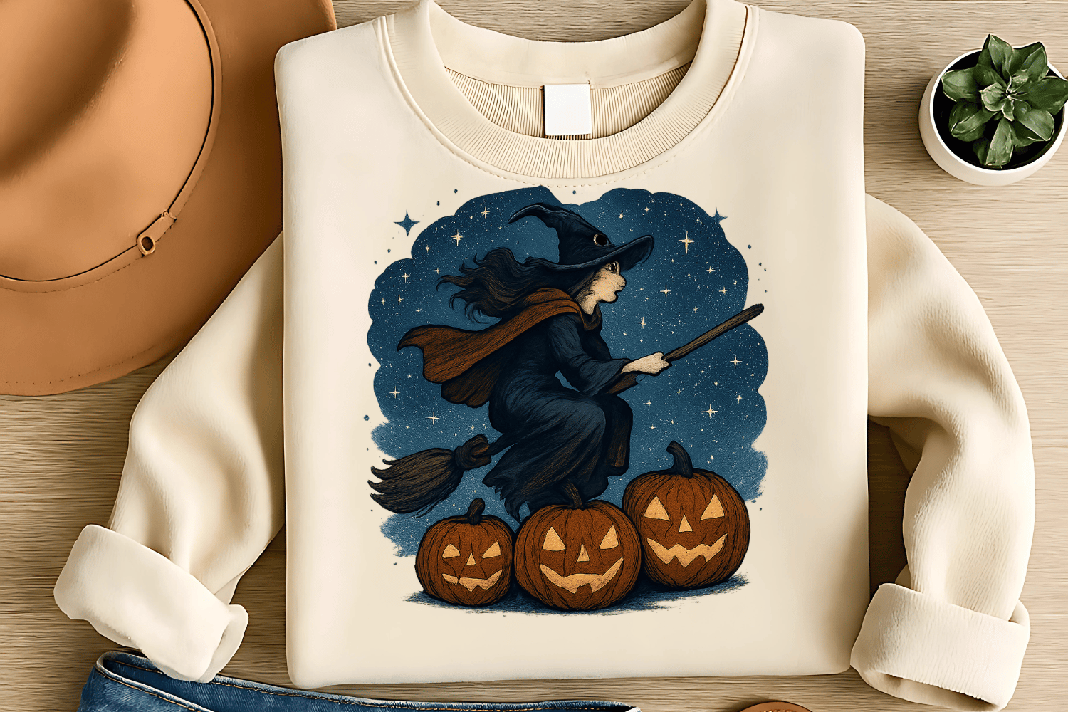 Broomstick Flight Witch Sublimation PNG – Flying Halloween Clipart for T-Shirts – Starry Night & Pumpkin Glow Theme – 300 DPI Instant Digital Download