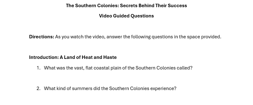 - Guided Questions - open-ended questions to answer while students watch the YouTube video.