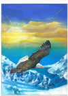 I used the eagle in my painting "Rise UP" to create this graphic eagle and mountain with some retro round circle style digital image.