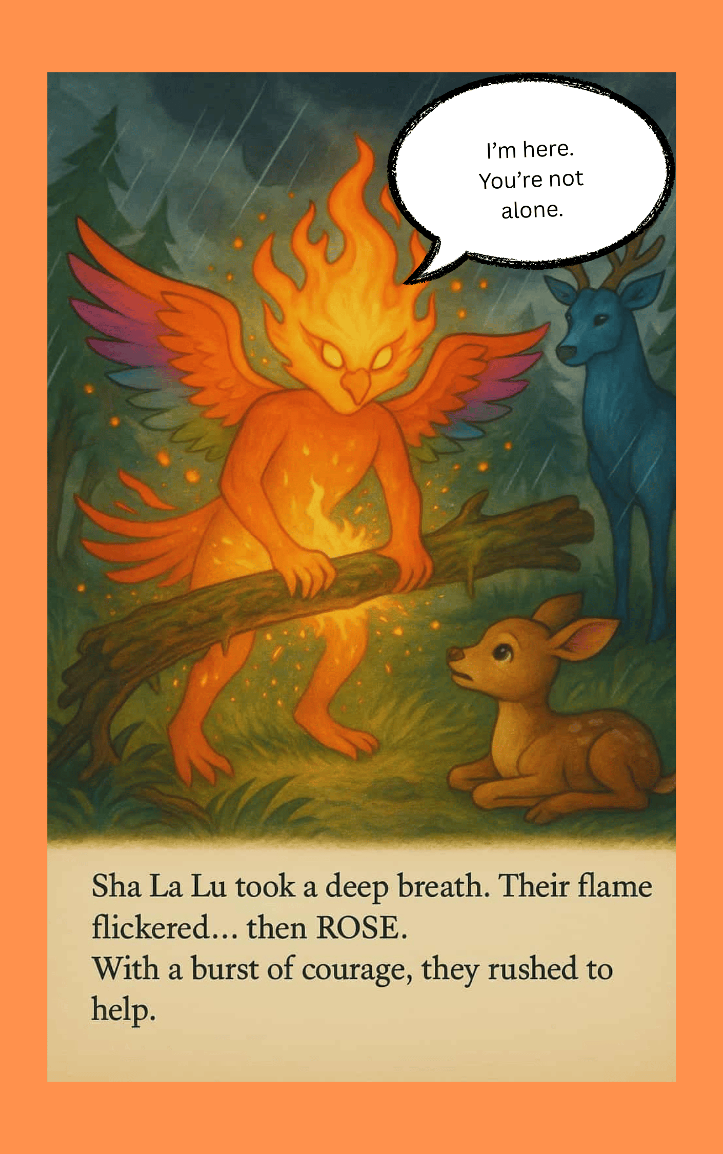 Guided by the Wise Deer and lifted by moments of floating joy, Sha La Lu discovers that their inner flame grows brighter every time they show kindness, bravery, or compassion. From facing challenges to comforting friends during storms, Sha La Lu’s light proves strongest when shared with others.