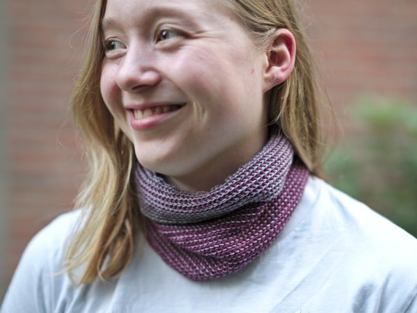 Der Cowl wird aus Kettmaschen in gegenläufigen Spiralen gehäkelt. Dadurch ergibt sich ein reversibles Nadelstreifenmuster.