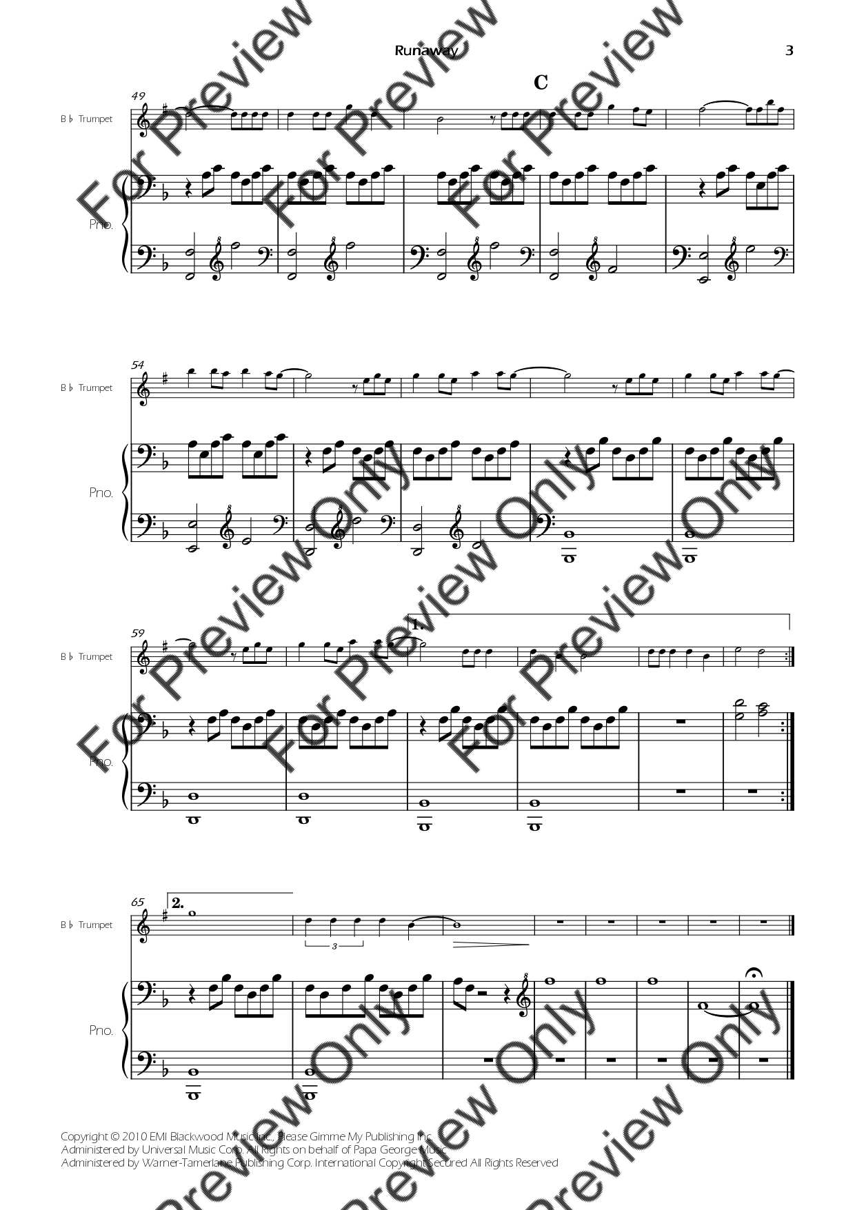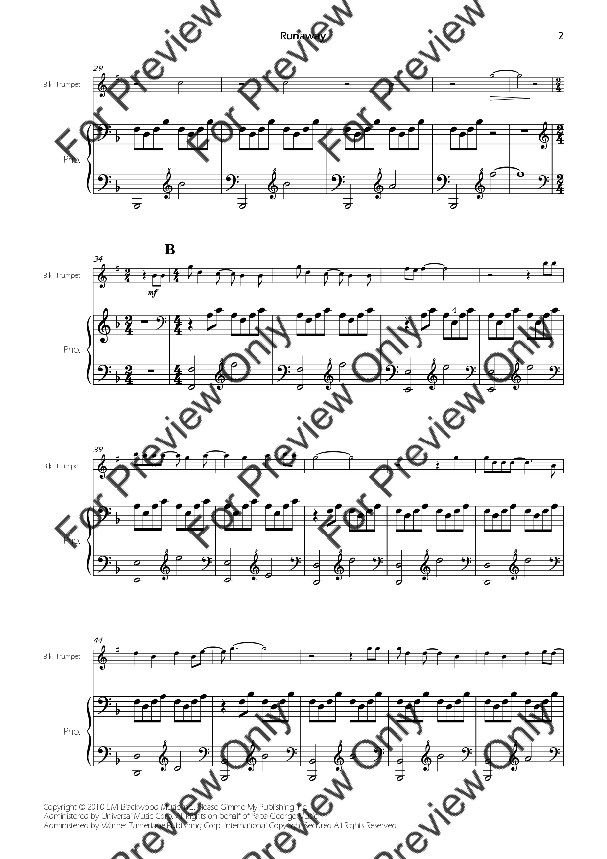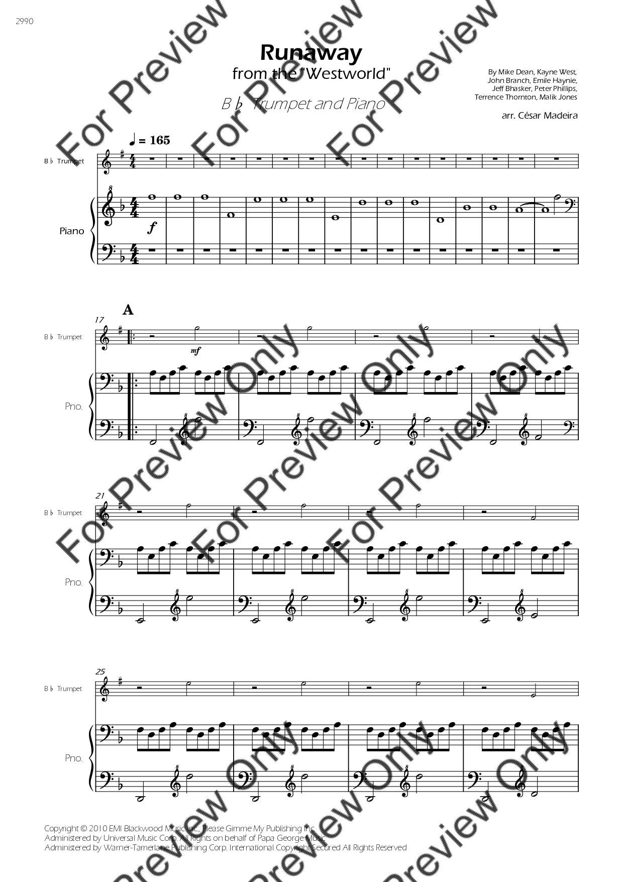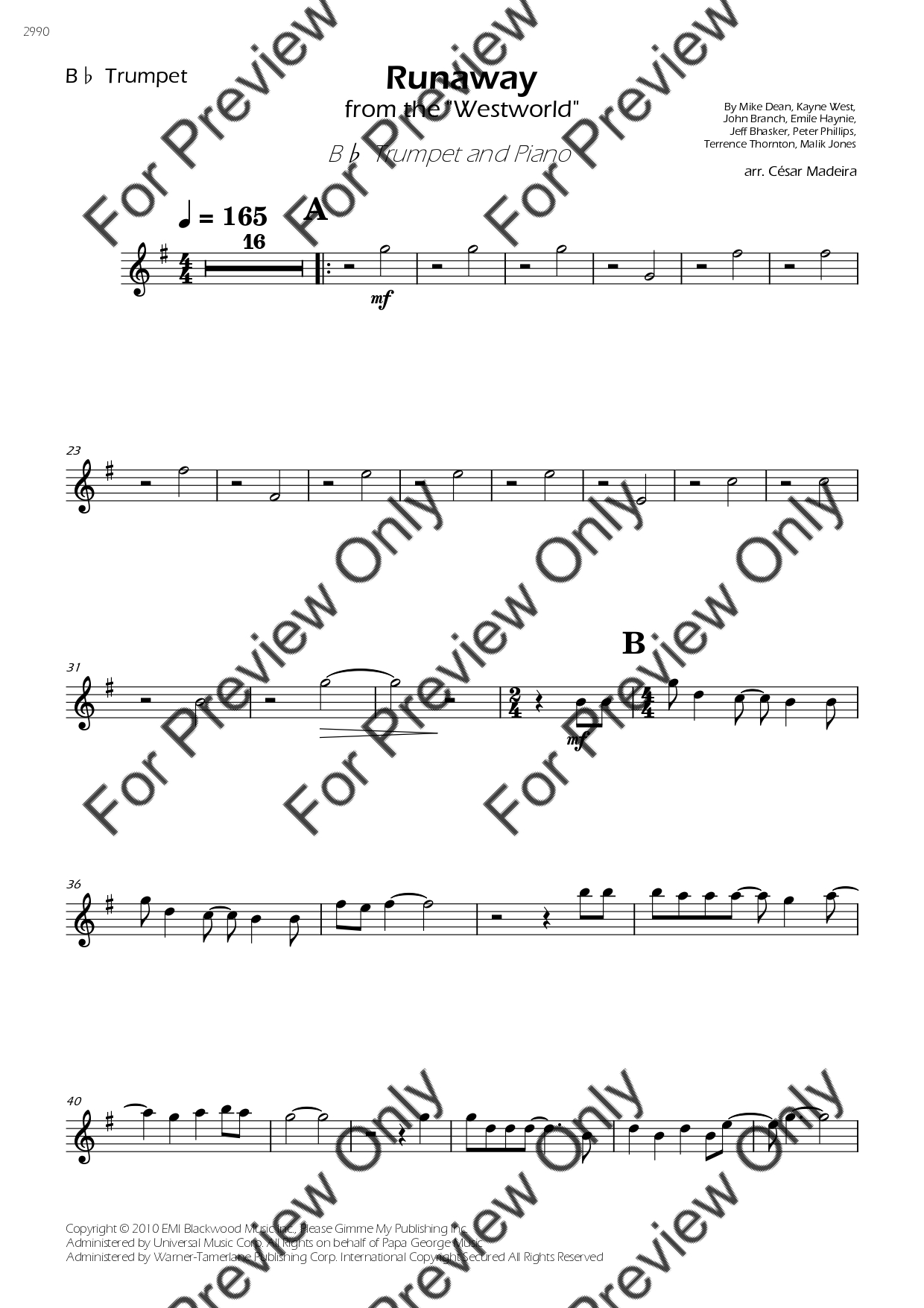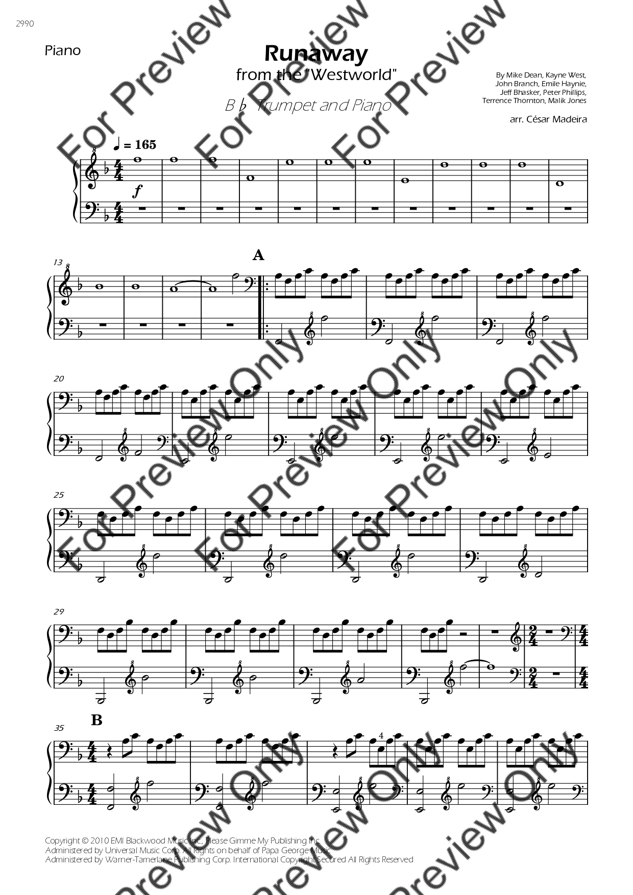 Runaway (from Westworld) by Kanye West. Arrangement for Bb Trumpet and Piano. With Full Score and Individual Parts. Have fun!
