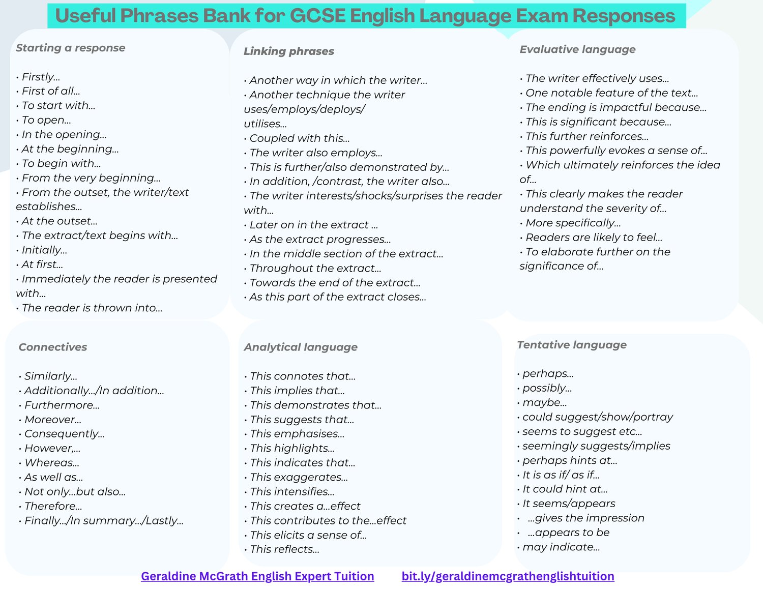 FREE RESOURCES Useful phrases bank for GCSE & IGCSE reading responses