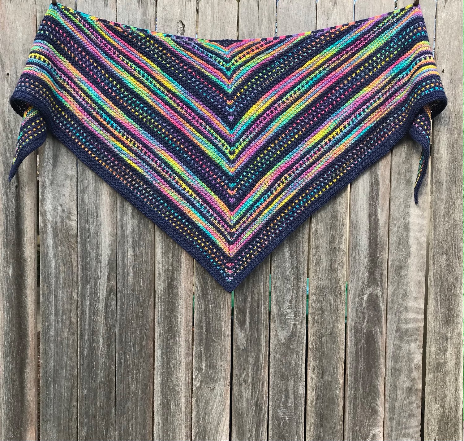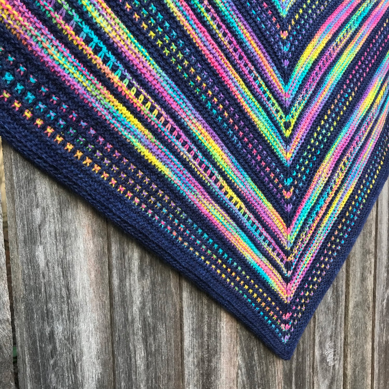 Burst is a wide triangle shaped shawl designed for that colourful DK weight (8ply) yarn that you can’t resist buying, but maybe struggle to find a way to showcase its beauty. The Burst shawl is specifically designed to highlight the very best of what variegated yarns have to offer, wonderful blending of many colours, as well as an opportunity for every colour to have its chance to shine. It is super-relaxing to knit, engaging with short sections that make you want to keep knitting and enjoying your yarn, and has simple stitchwork for ease and fun.