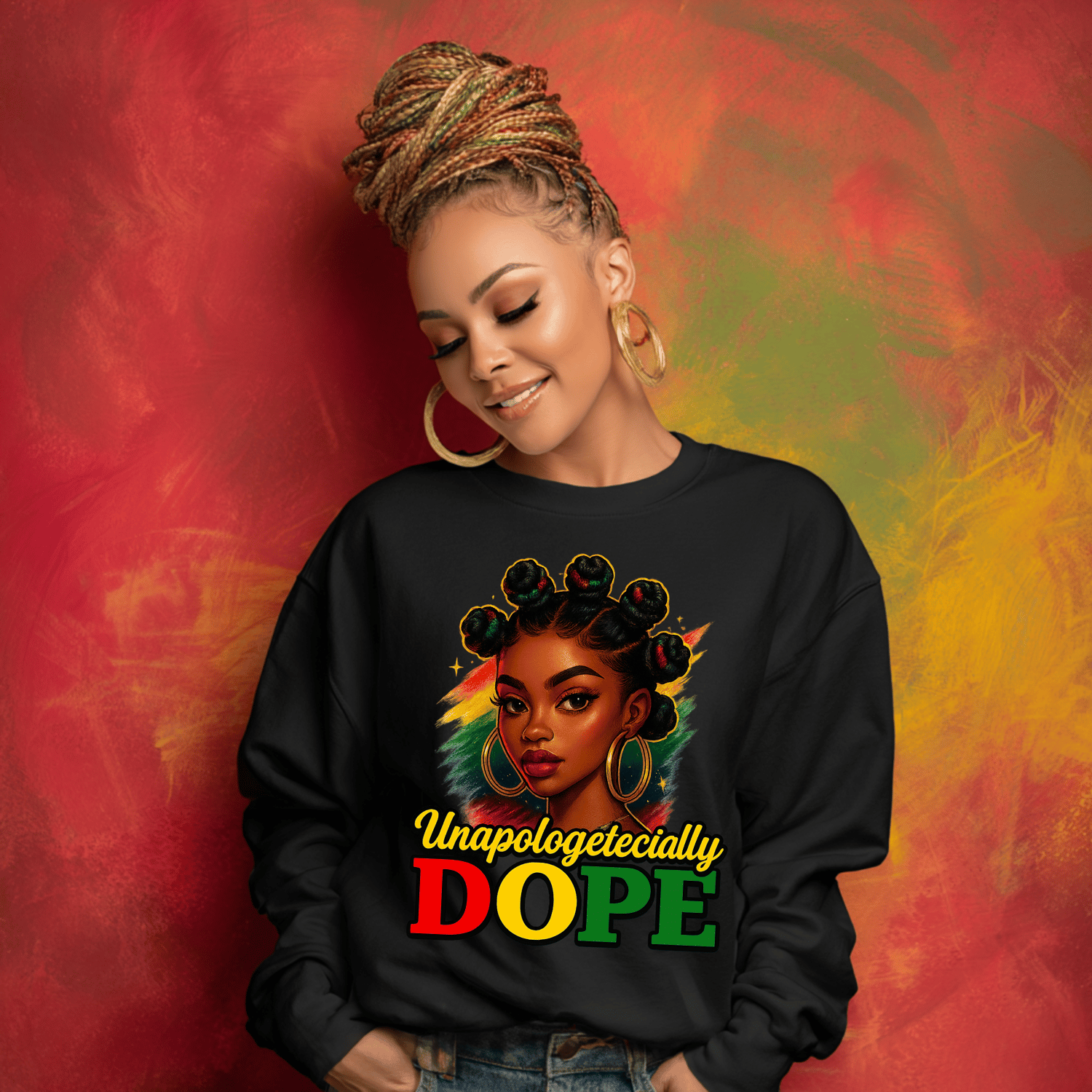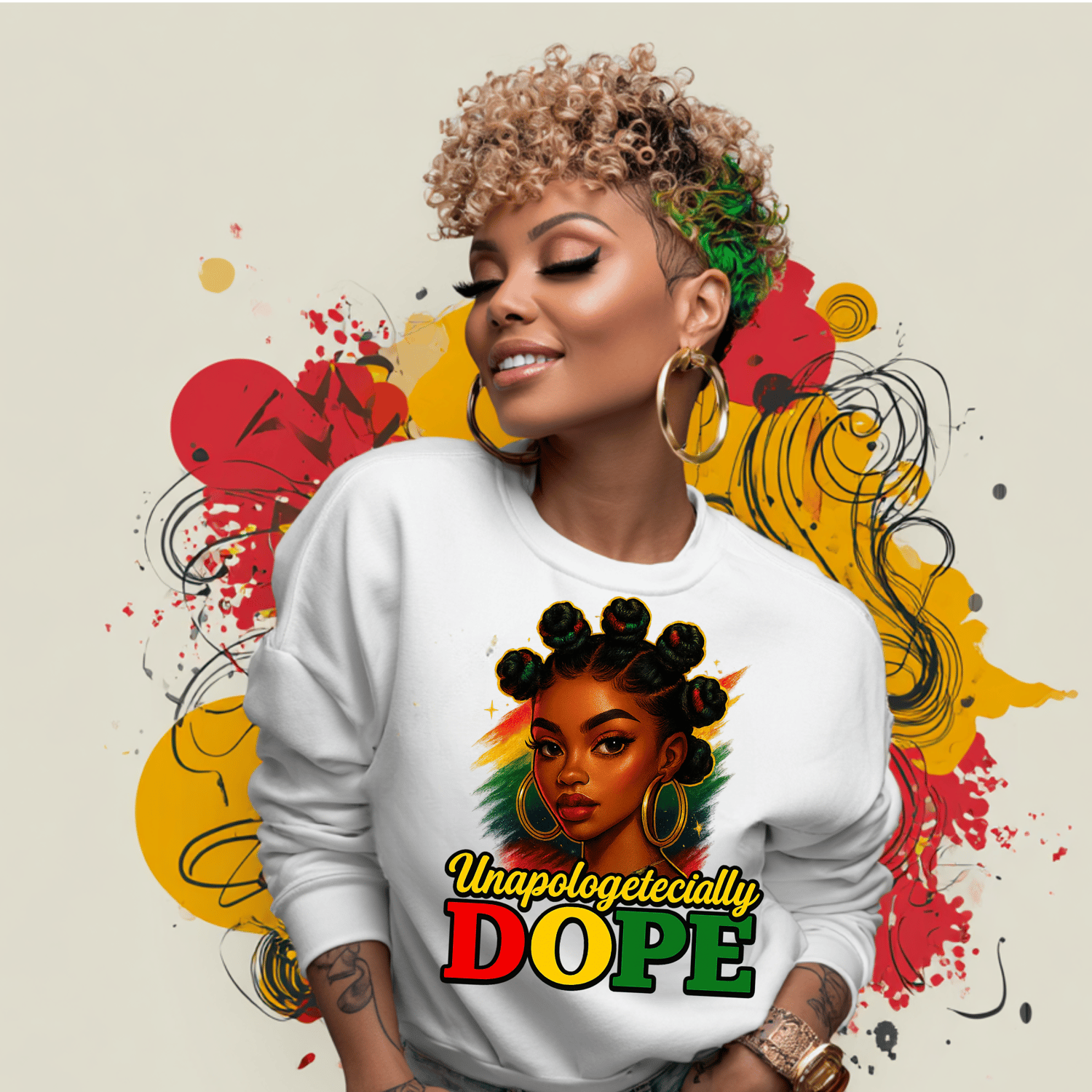 The Unapologetecially DOPE – Bantu Knots Edition celebrates culture, confidence, and self-expression without compromise. Featuring a stunning melanin queen with bold Bantu knots, gold hoops, and vibrant red–gold–green energy, this design honors heritage while radiating modern boss energy.