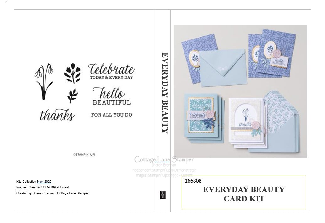 A printable case insert, in PDF form, for your "Everyday Beauty" Nov 2025 card kit from the Stampin' Up! Online Kits Collection. Great for storing your stamps and extra pieces.