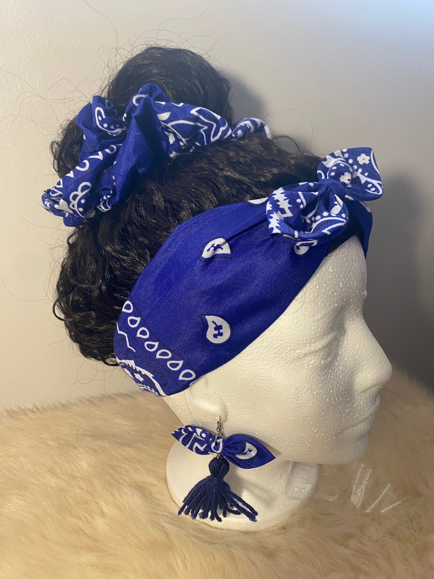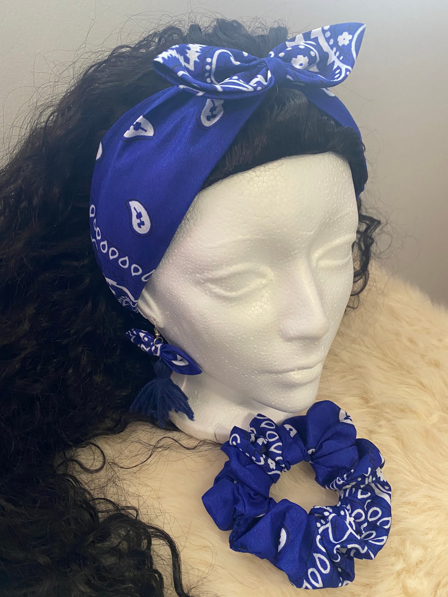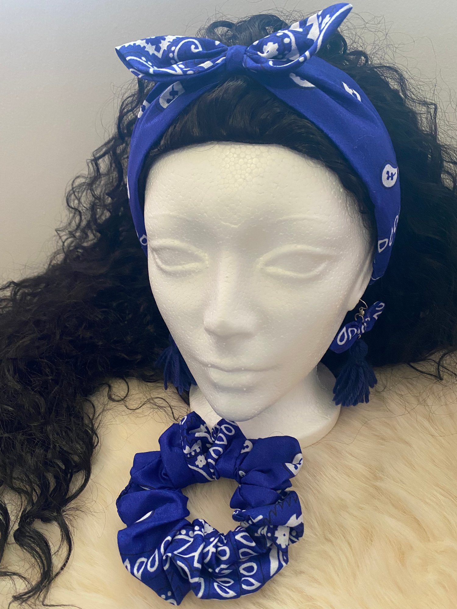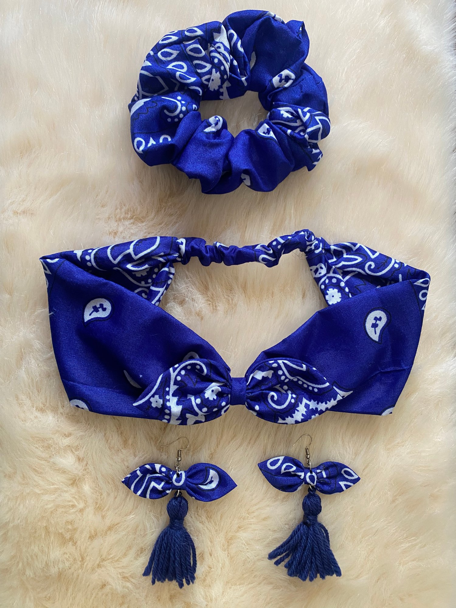 Blue Bandana Accessories Set – Headband, Scrunchie & Tassel Earrings
