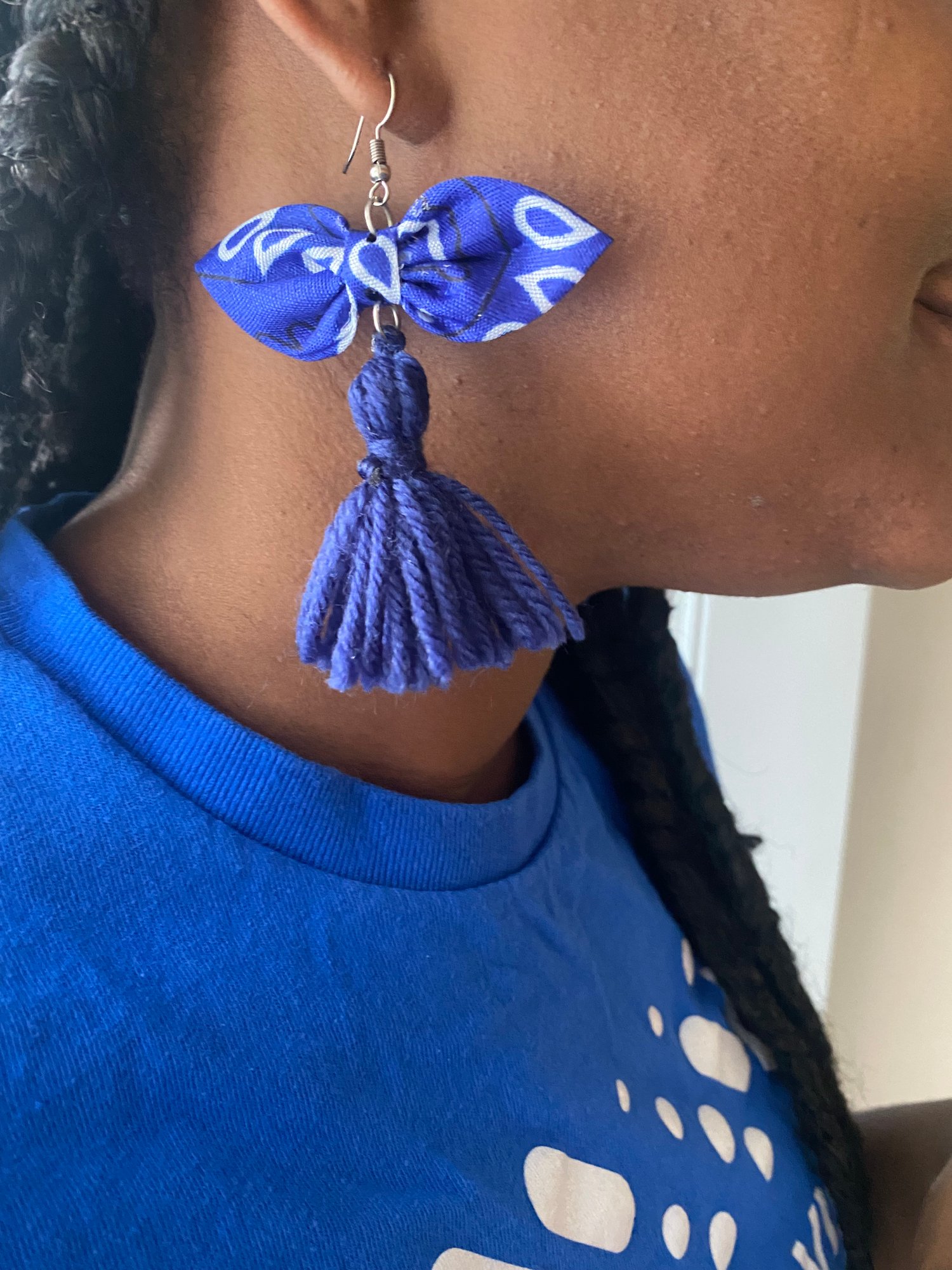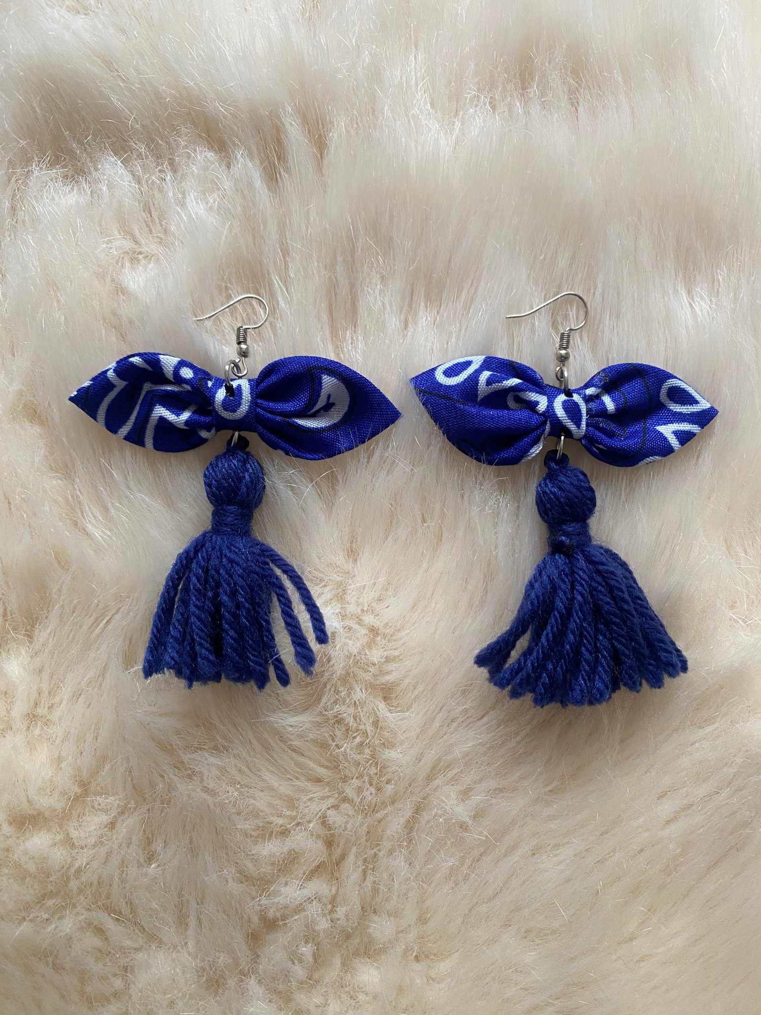 - Tassel Earrings – Lightweight and eye-catching, featuring matching fabric bows and navy tassels for a playful finish.