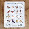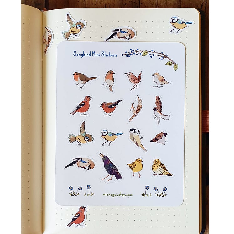 The songbirds sticker sheet features 16 different mini stickers (approx. 2 - 2,5 cm / 0.8 - 1 in).