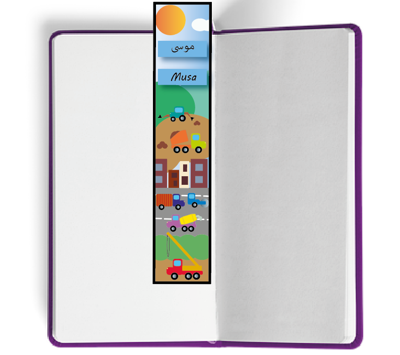 This brightly coloured bookmark can be personalised by adding your child's name in Arabic and English (or any other preferred language) in the boxes provided.