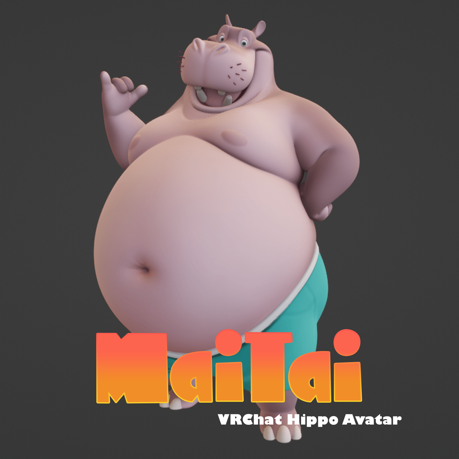 (PC-only) The new and improved MaiTai the Hippo! Customizable avatar for VRChat and other social VR apps. This model is avatar 3.0 and comes with toggleable clothing and body morphs. Also included are sample retextures and alternative skin colors. Source textures in PSD format for recoloring in Substance Painter, and Blender project for modifying 3D mesh or creating your own blend shapes.