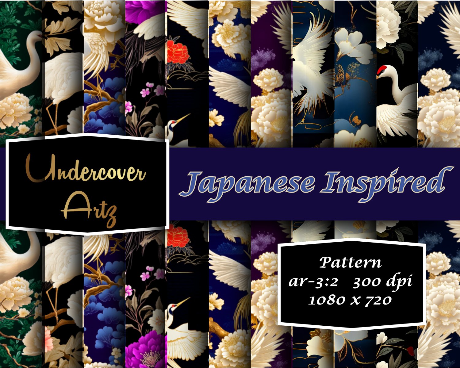 Immerse yourself in rich florals, delicate gold accents, and beautiful cranes inspired by traditional Japanese aesthetics with a modern, luxurious twist. This set of 30 high-resolution PNG files is designed for creators who want to add a bold, cultural, and elegant touch to their work.