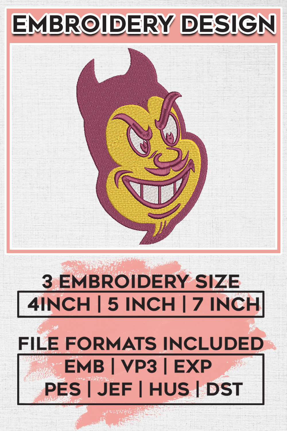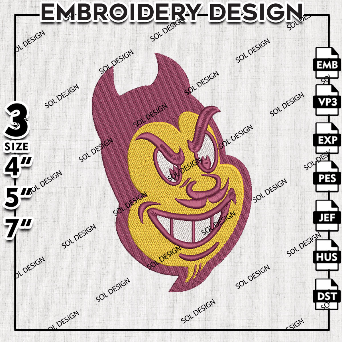 NCAA Arizona State Sun Devils Football Team Head Mascot Logo Embroidery Designs, NCAA Arizona State Sun Devils Machine Embroidery Files, NCAA Logo embroidery designs, NCAA Arizona State Sun Logo, Digital Download