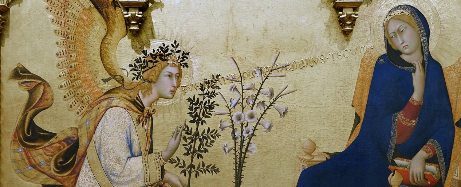 The original of Simone Martini’s Annunciation (1331) was created as a sacred conversation across a large panel: the angel approaching from the left, the Virgin receiving the message of redemption for all mankind, on the right.