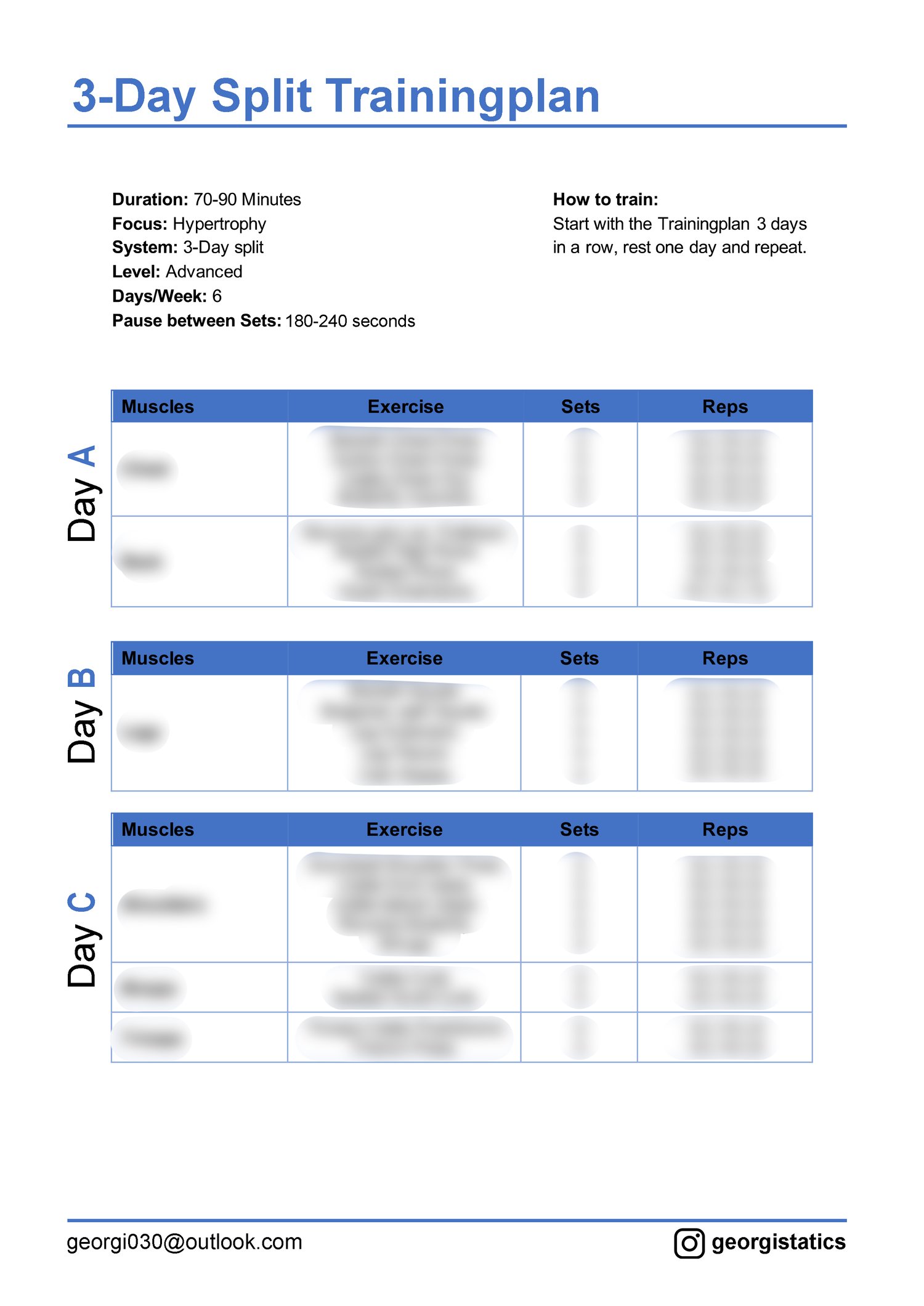 My personall program, utlizing a modified 3 Day split training. This workout plan is designed for intermediate/advanced athletes who have a more open schedule and look to workout 6 times per week with intense training frequency. It will focus on strength, size and aesthetics to get the best results possible.