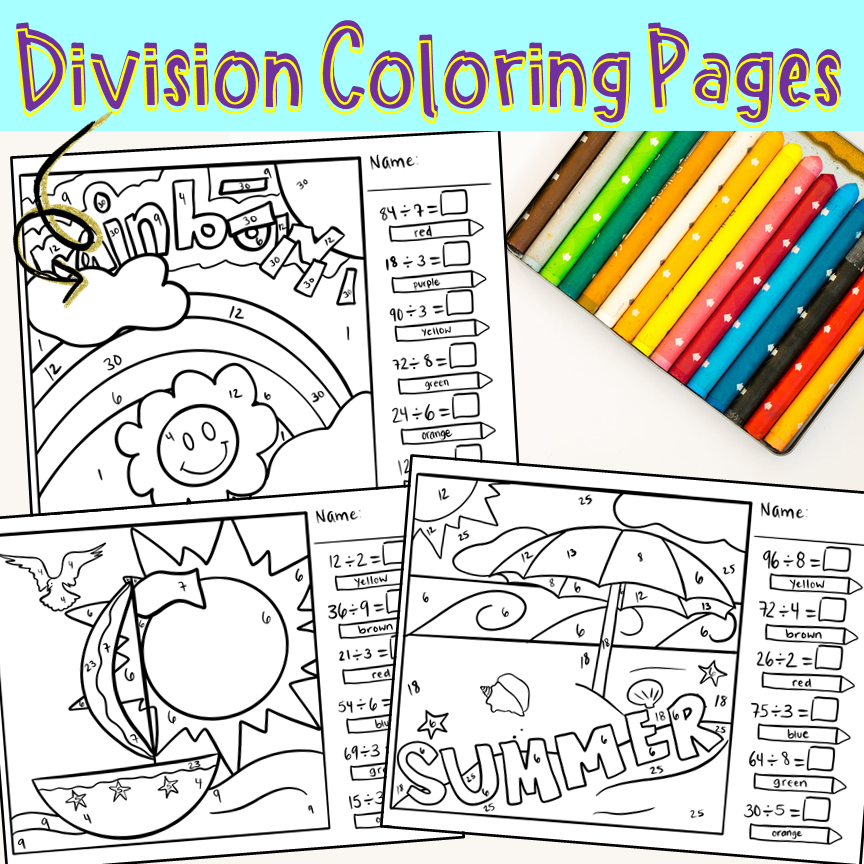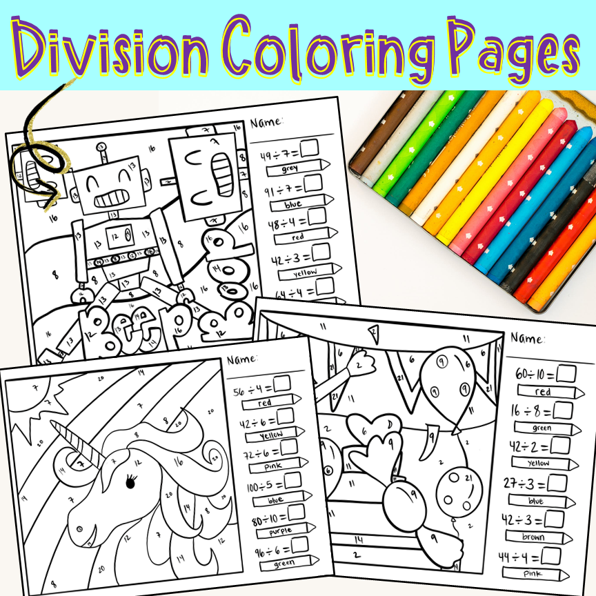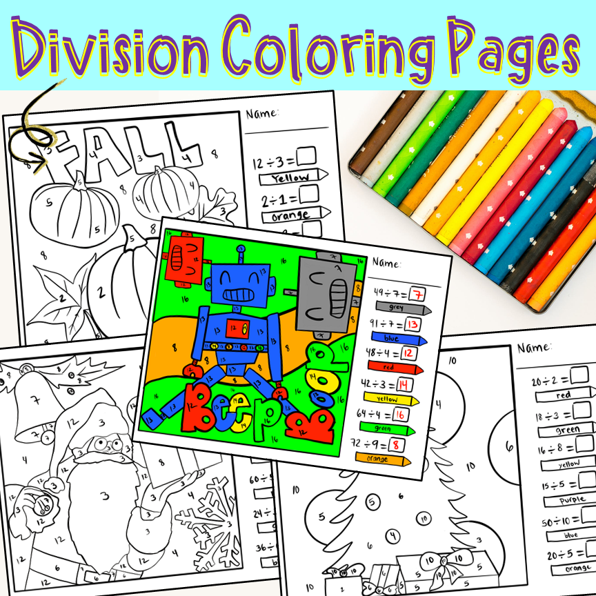 Let's have our kiddies practice their division skills in a fun way! These pages will be a FUN addition to any classroom practicing their division skills. You will find pages themed for summer, spring, fall, Halloween, Christmas, unicorn, and robots.