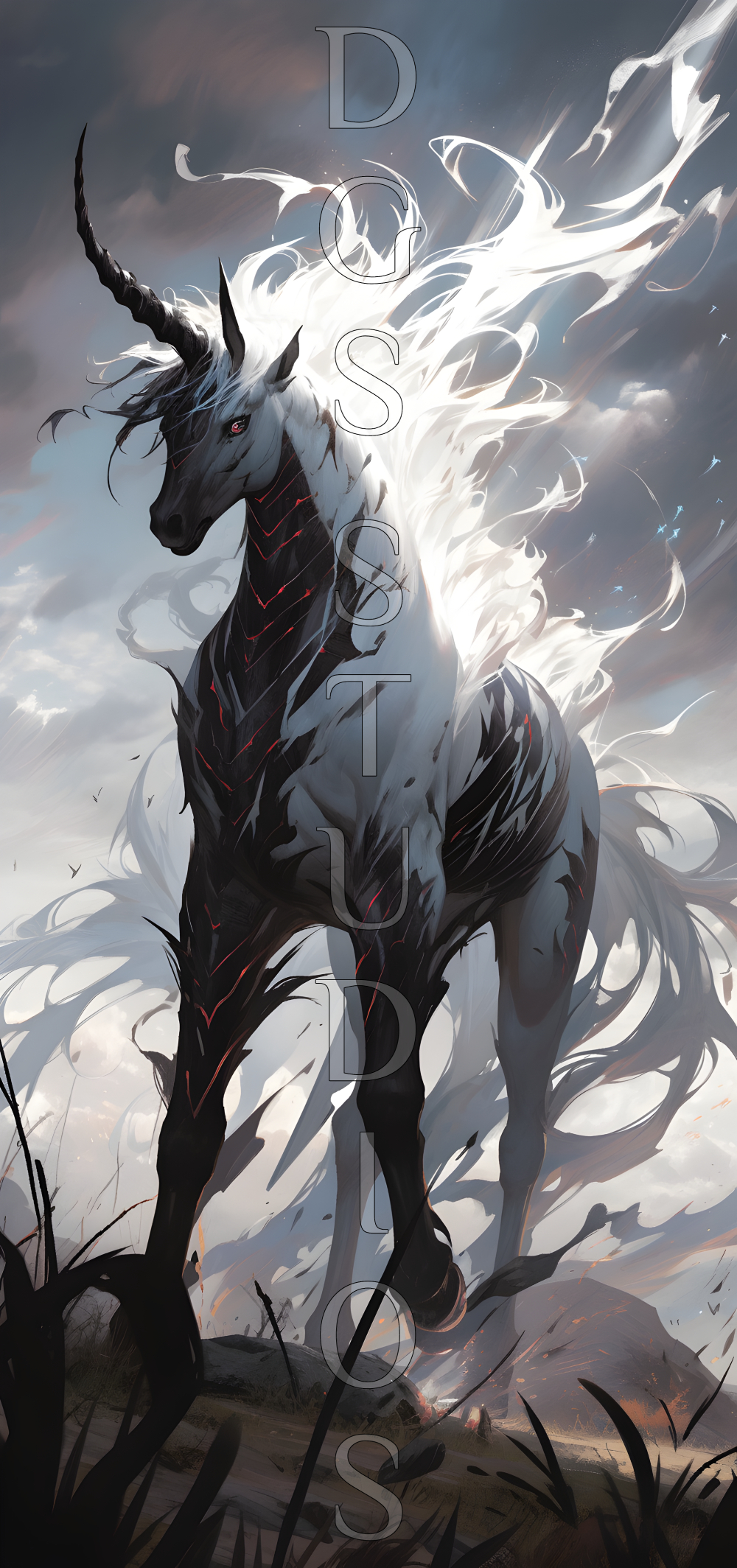 6K HD digital artwork featuring a dark unicorn galloping on a fantasy battlefield! This is royalty-free and can be used in any project. You will receive the original, HD, non-watermarked file when you download for your use.