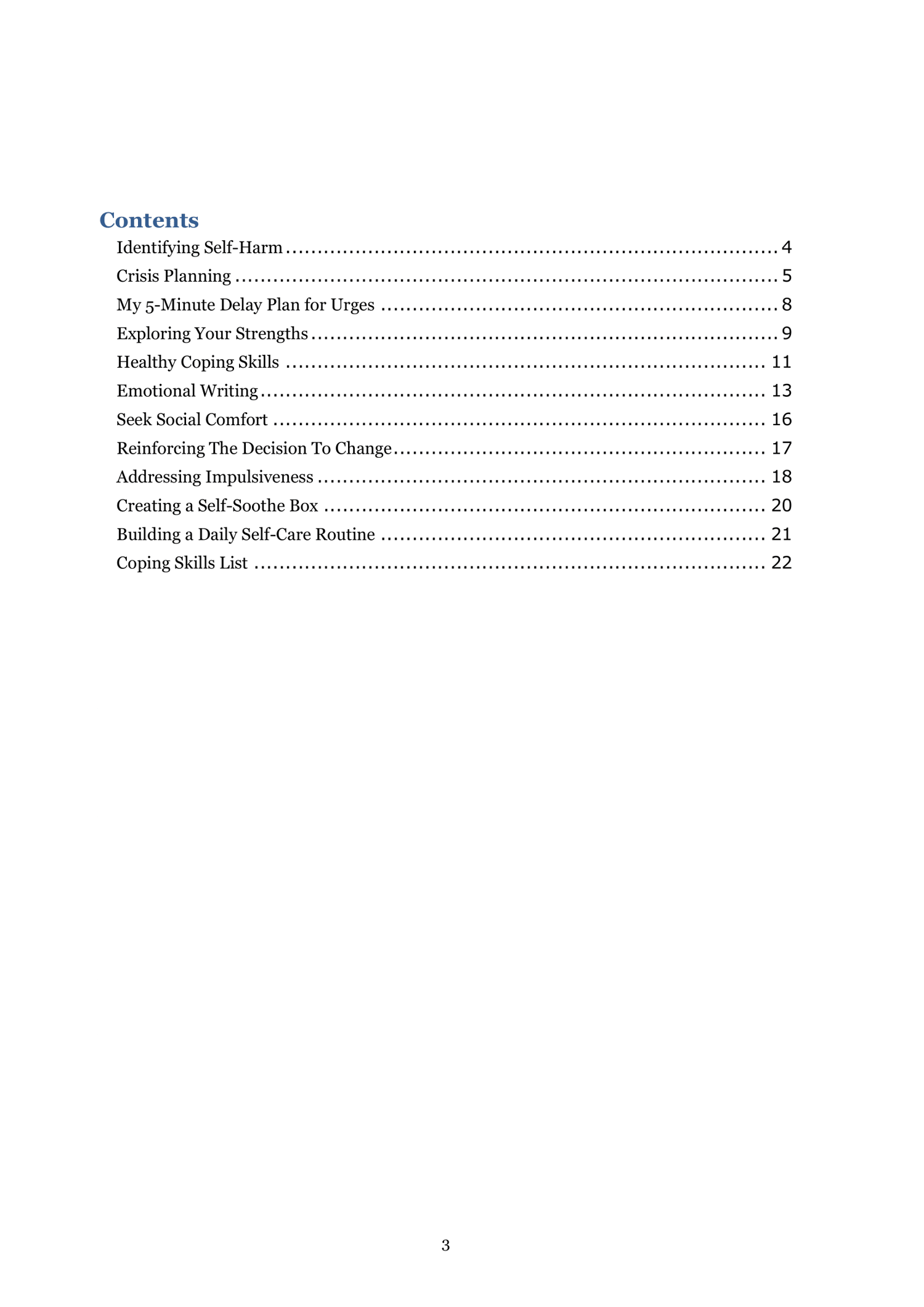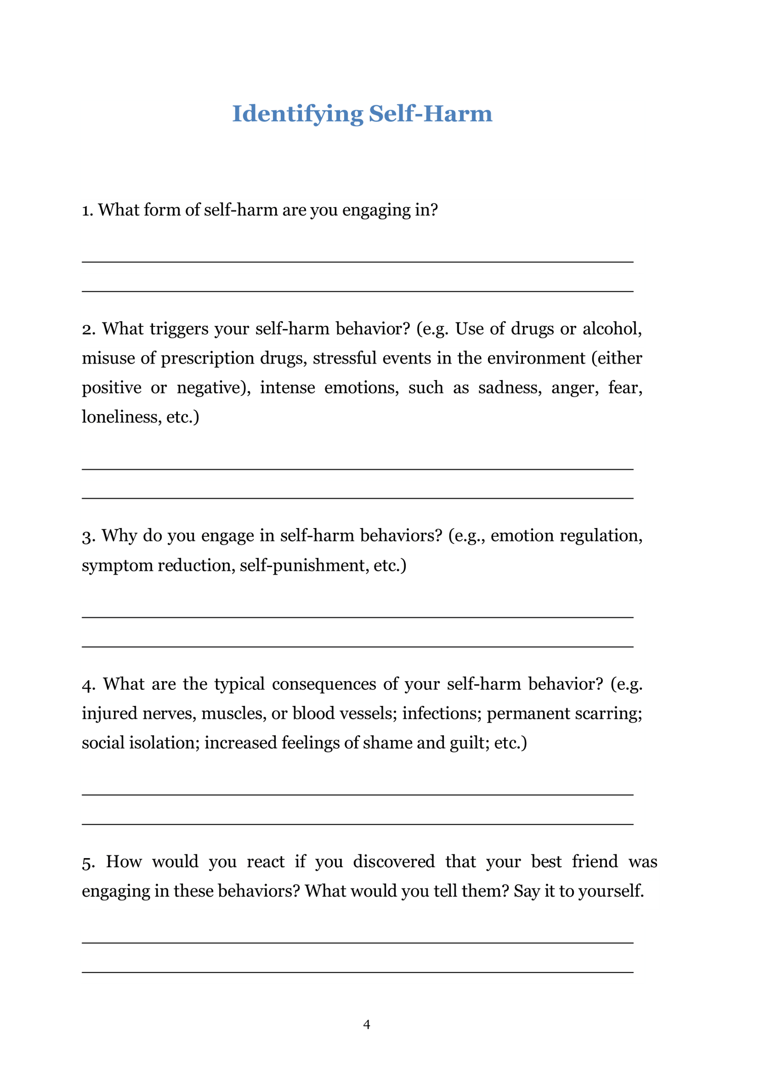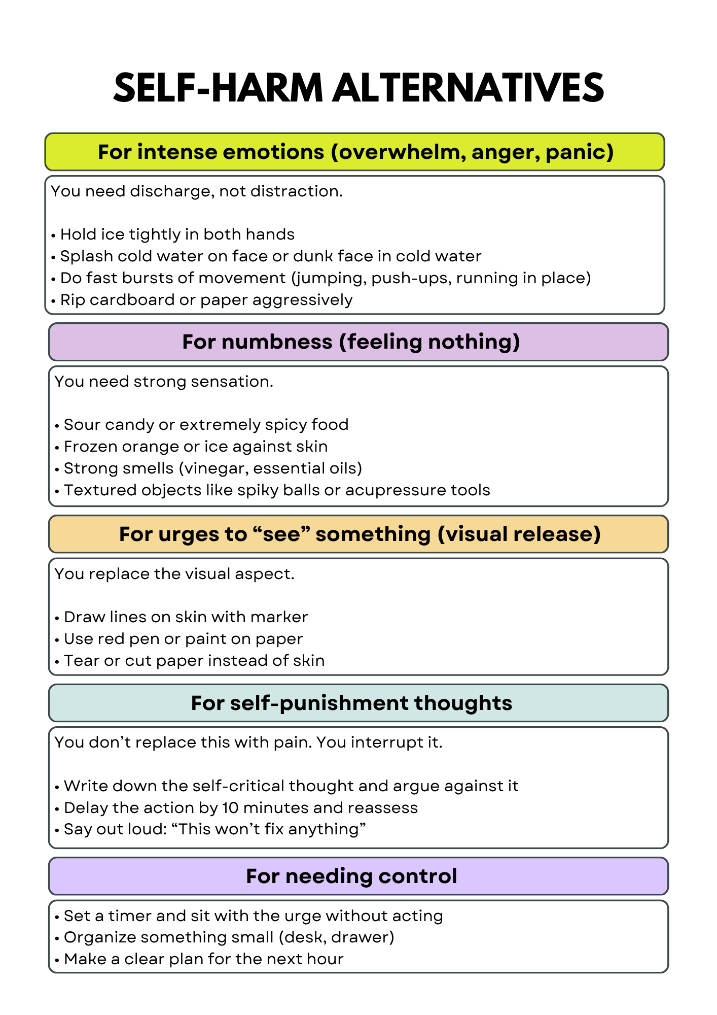 - Identify triggers, thoughts, and situations that lead to self-harm urges