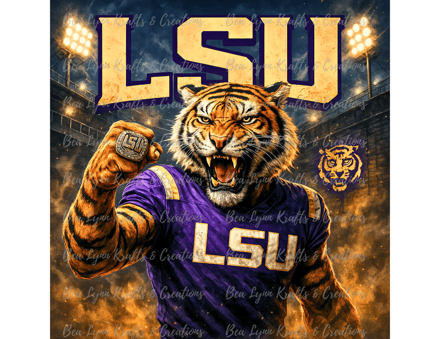 Set against a blazing stadium backdrop and built with incredible detail, this design is tailored for fans, creators, and entrepreneurs looking to turn LSU pride into bold, sellable products or head-turning fan apparel.
