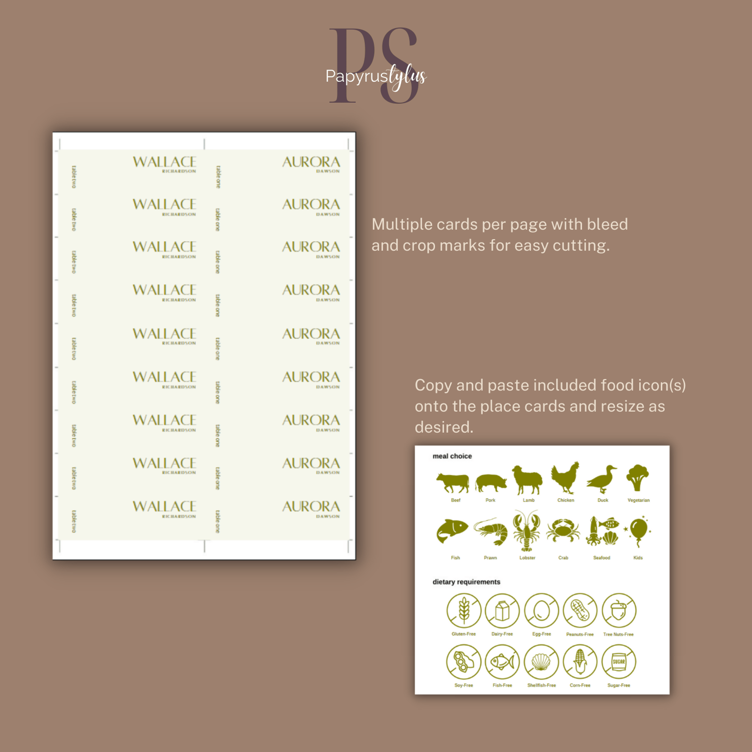 Food icon(s) in the same colours are also included in the product. They can be added to the place cards as desired to help your guests recall their meal choices selected months ago, and let the caterers beware of your guests' dietary requirements.