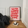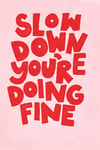 This “Slow Down You’re Doing Fine” wall art is a gentle reminder to breathe, pause, and trust your pace. With bold hand-painted red lettering set against a soft pink background, this poster brings warmth, reassurance, and cozy calm into your space.