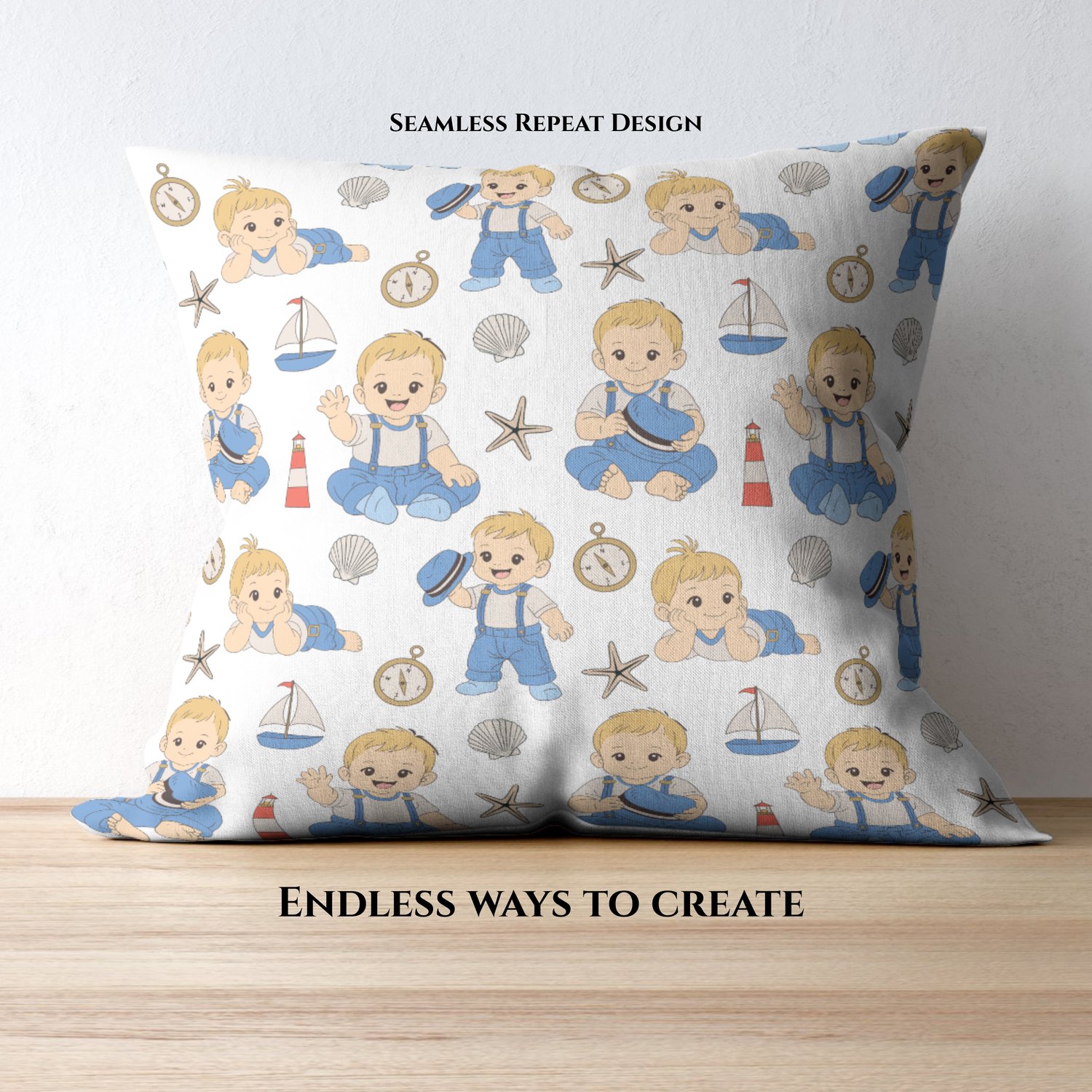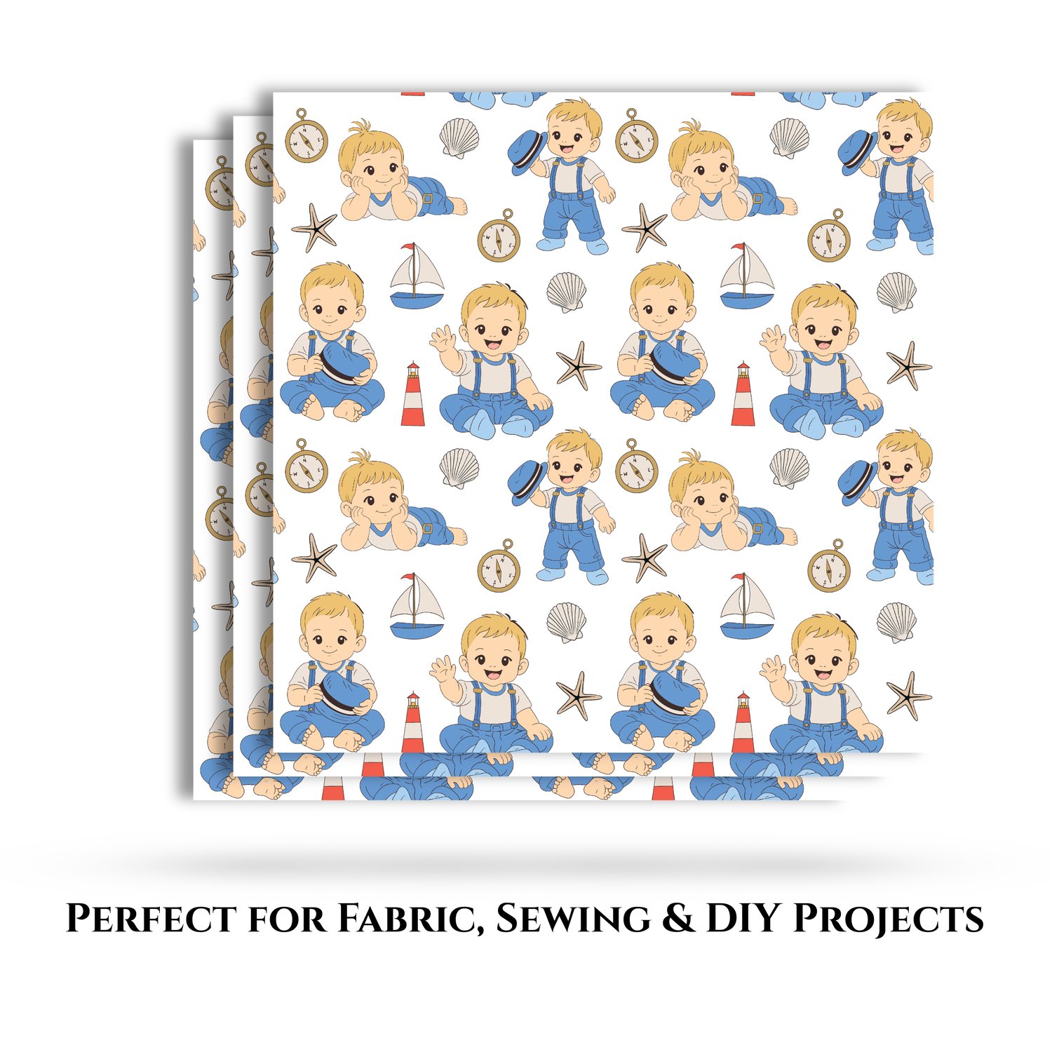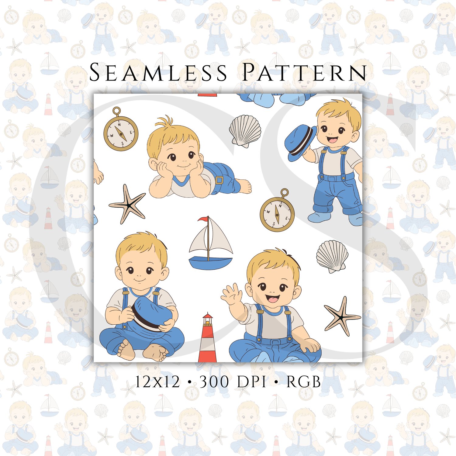 A sweet nautical baby pattern featuring sailboats, lighthouses, seashells, and adorable baby boy illustrations — perfect for nursery projects, baby shower gifts, and coastal-themed crafts.