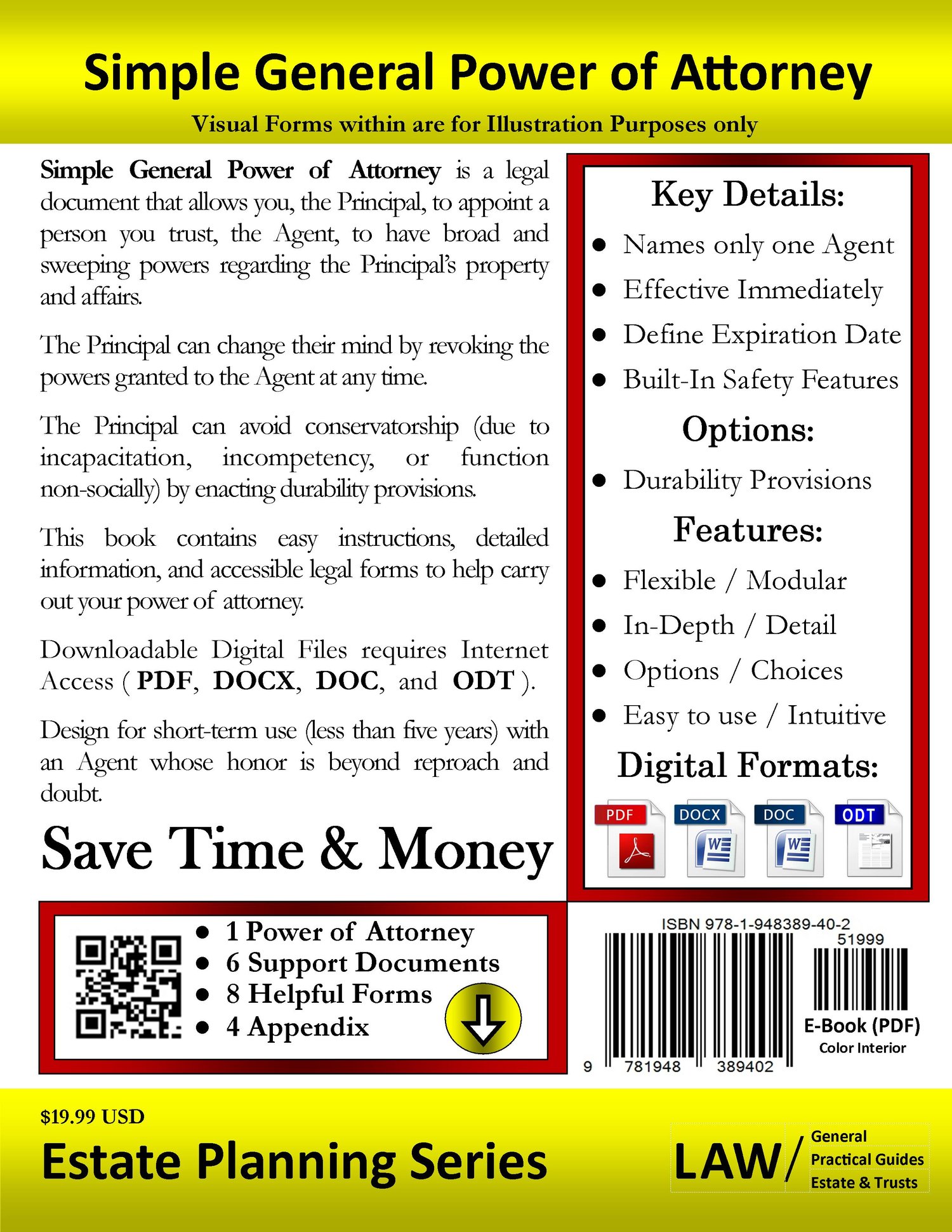 The book consists of (01) one Simple Power of Attorney (General), (06) six Supporting Documents, (05) five Miscellaneous Forms, (03) three Recommended Forms, and (04) four Appendix. This Power of Attorney has an estate planning focus that provides options, depth, and flexibility while maintaining uniformity with built-in and optional (Durability Provisions) safety features.