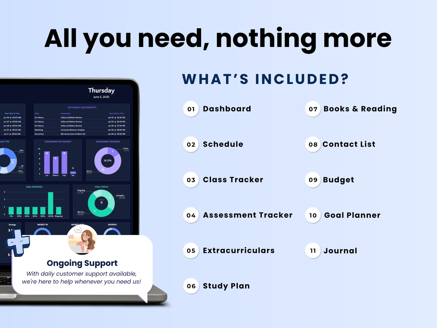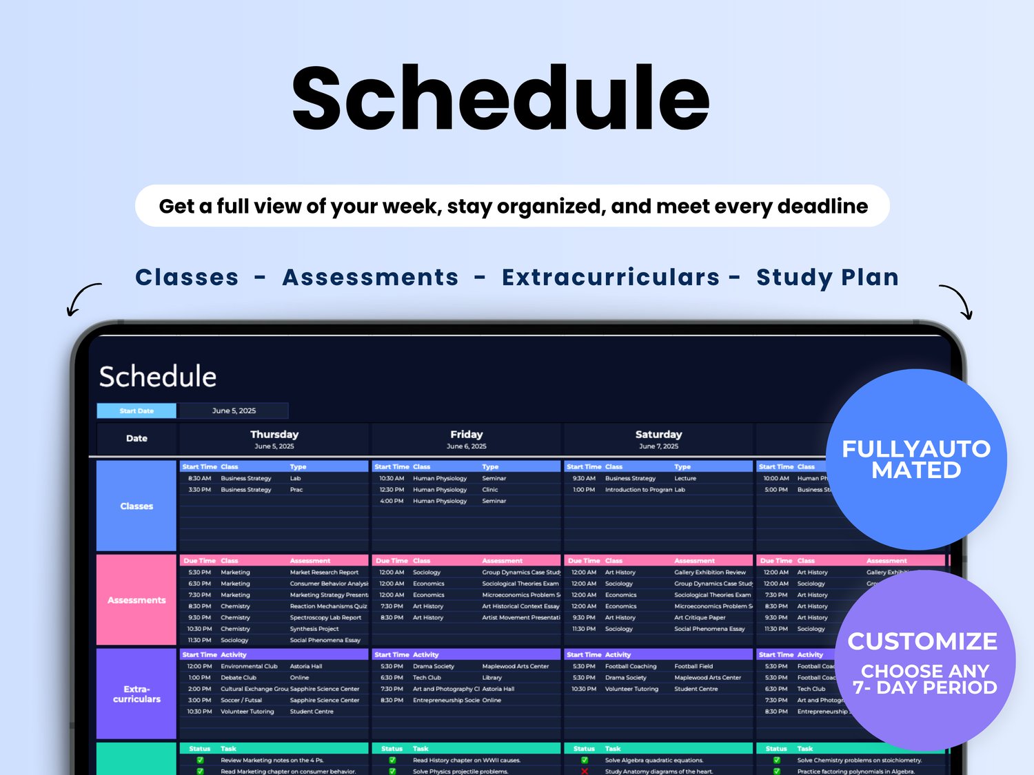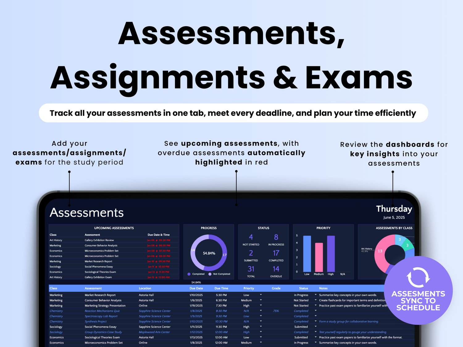 ✅ Assessments: Monitor your assessments/assignments/exams, and due dates in one organized tab.