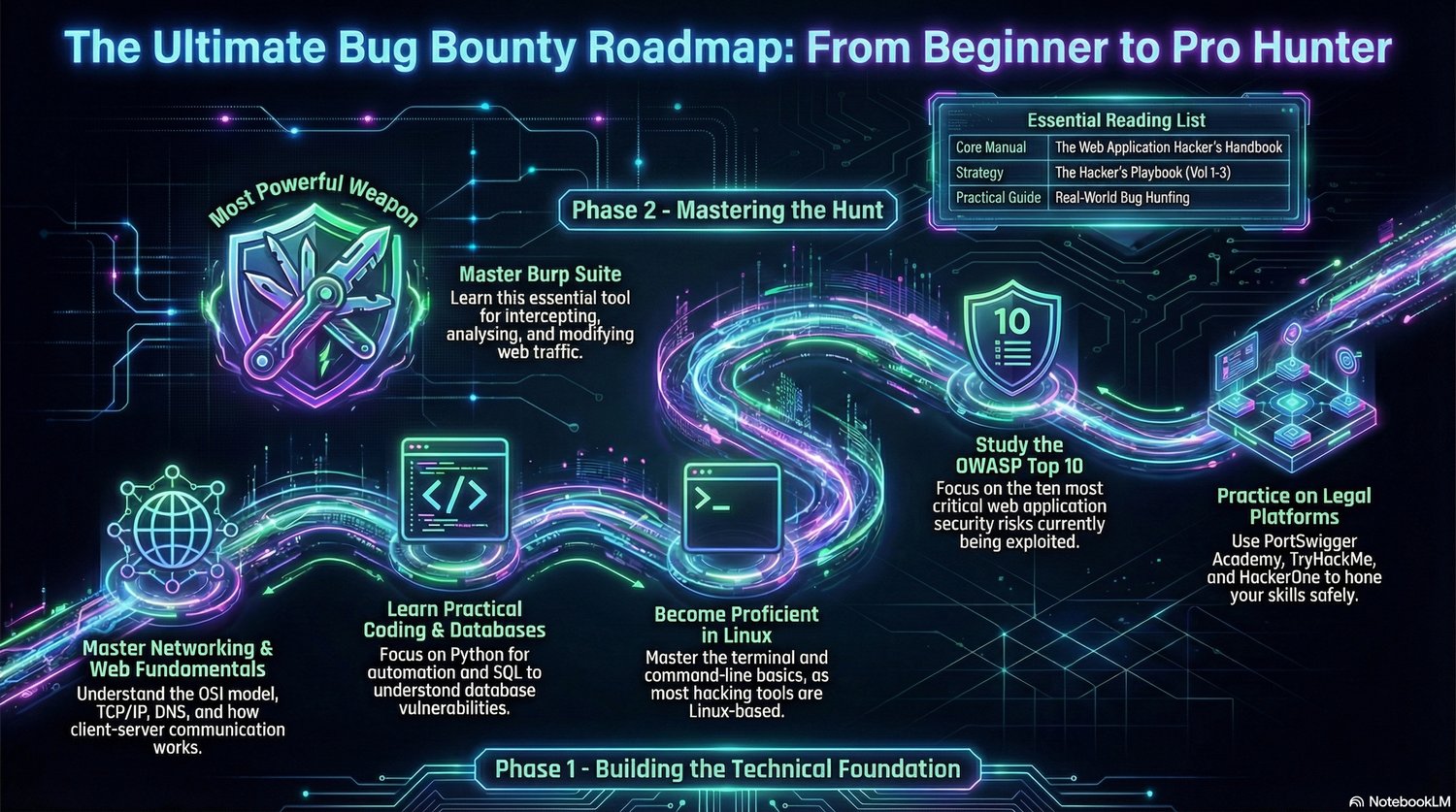This Ultimate Bug Bounty Roadmap is a structured, step-by-step blueprint designed to take you from technical foundations to mastering real-world vulnerability hunting.