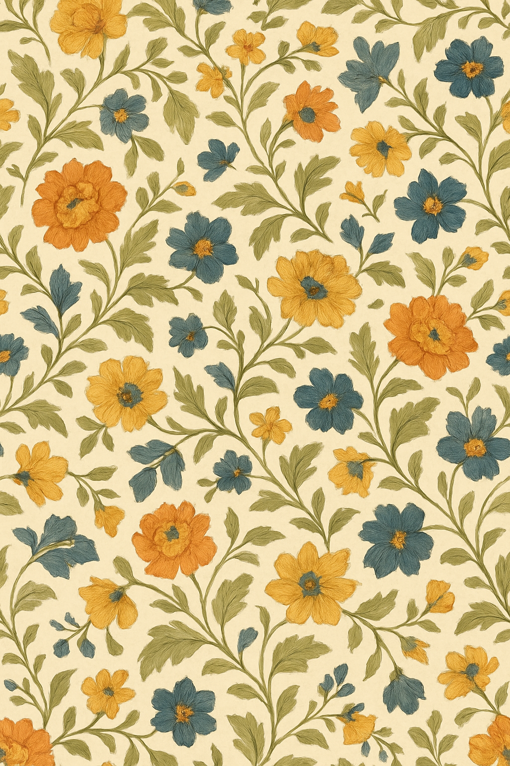 Transform your space with this elegant floral wallpaper design. Featuring beautifully hand-drawn flowers in warm oranges, deep blues, and soft yellows, this seamless pattern exudes vintage charm and natural grace. Perfect for digital decor, home design projects, and textile prints