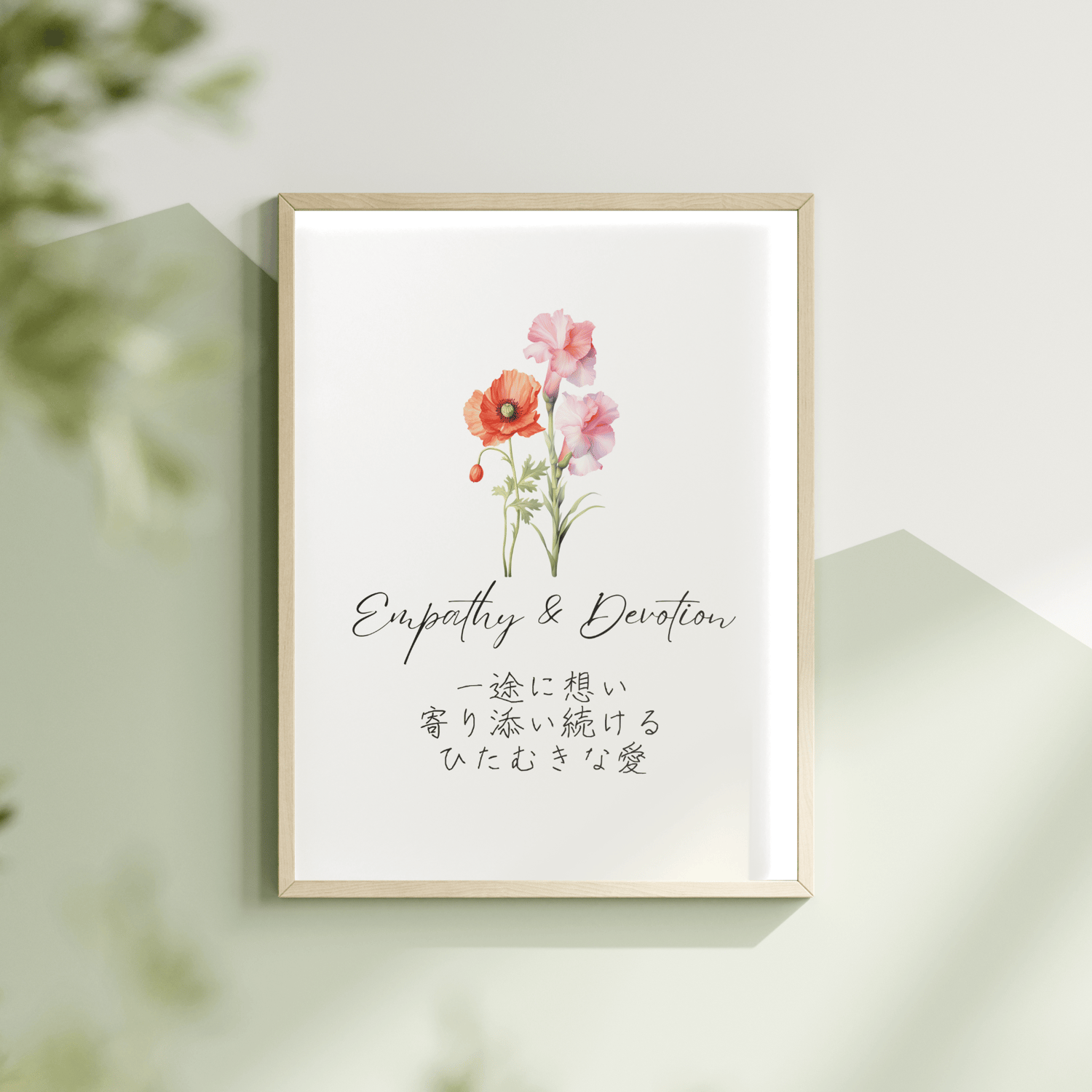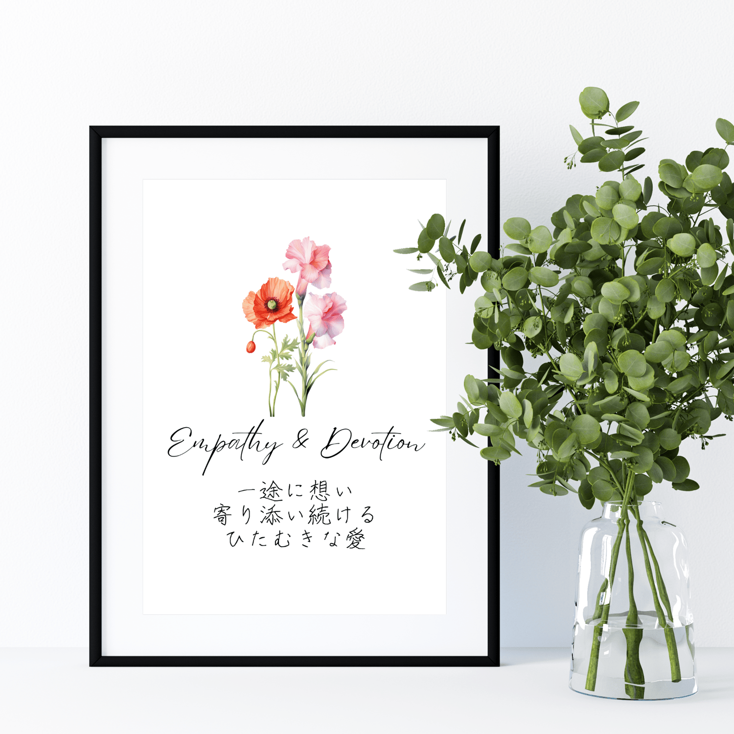 I'm delighted to present my watercolor art of August's birth flowers, the poppy and gradiolus. This piece is enriched with Japanese quotes inspired by the language of flowers, symbolizing dedicated and unwavering love. It's printed on high-quality materials, ready to add a touch of beauty to any room.