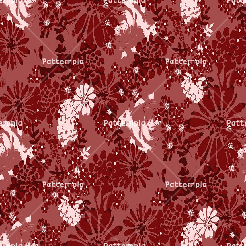 Dense textured floral motifs in tonal red and pink.
