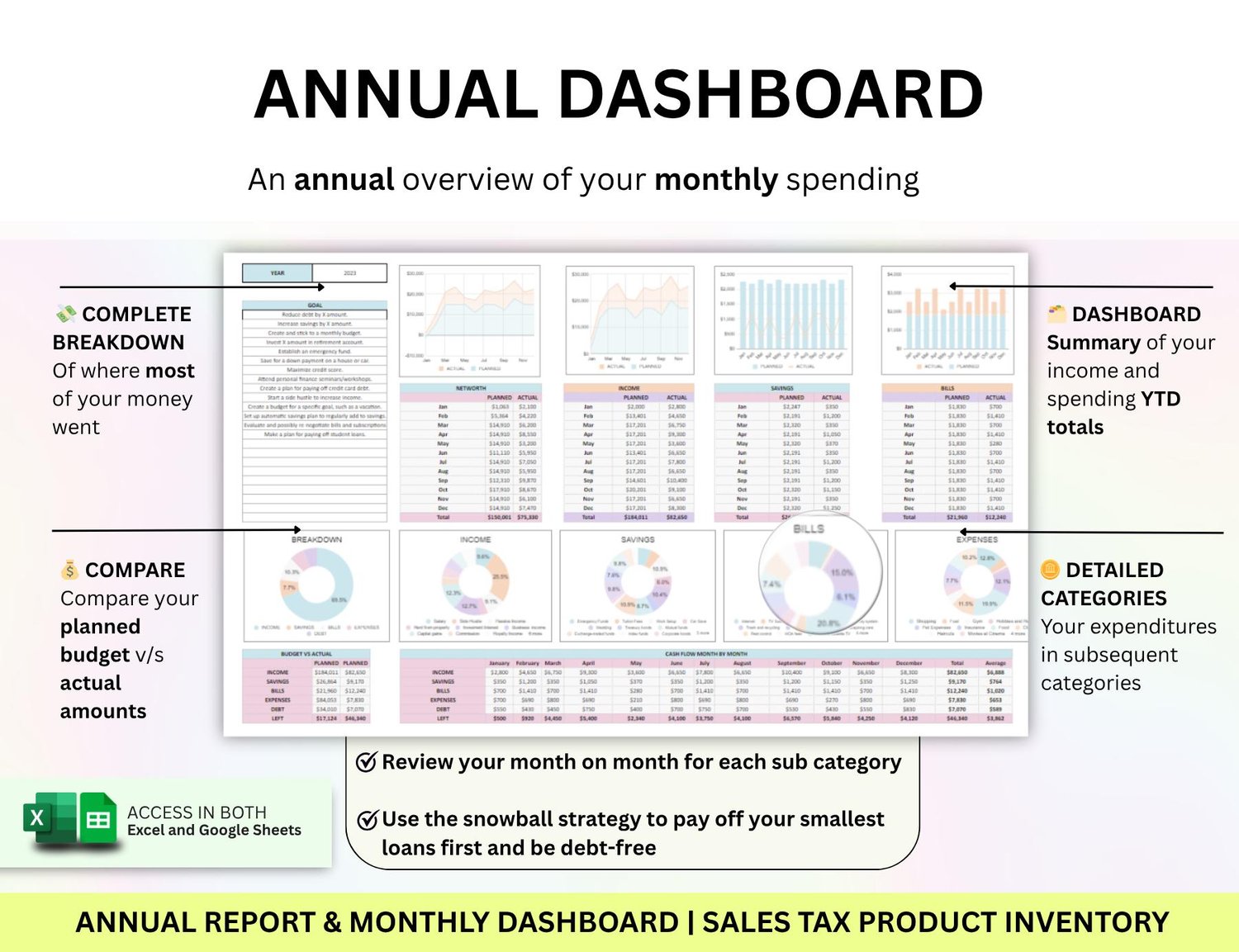 • ANNUAL DASHBOARD - A detailed summary of your monthly income and spending. Review your monthly totals per category. Analyze monthly totals per category with visually appealing charts and graphs.