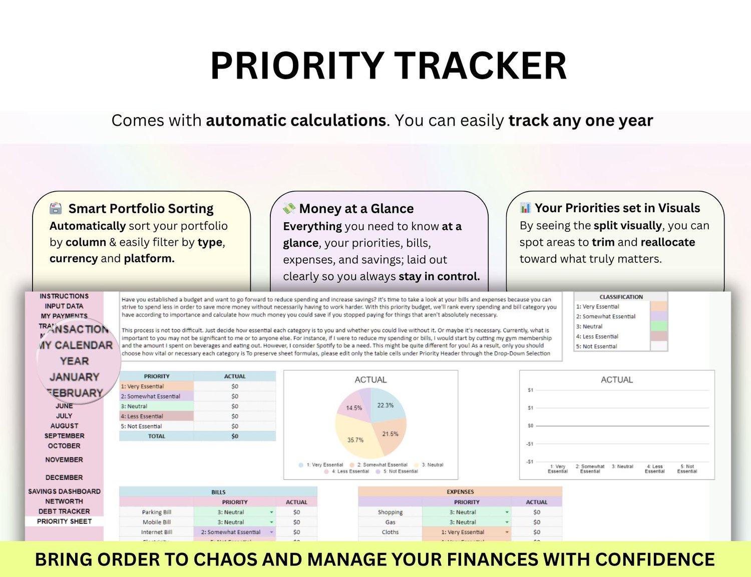• PRIORITY SHEET - With this priority budget, rank every spending and bill category according to importance and calculate how much money could be saved if you stopped paying for things that aren't absolutely necessary.