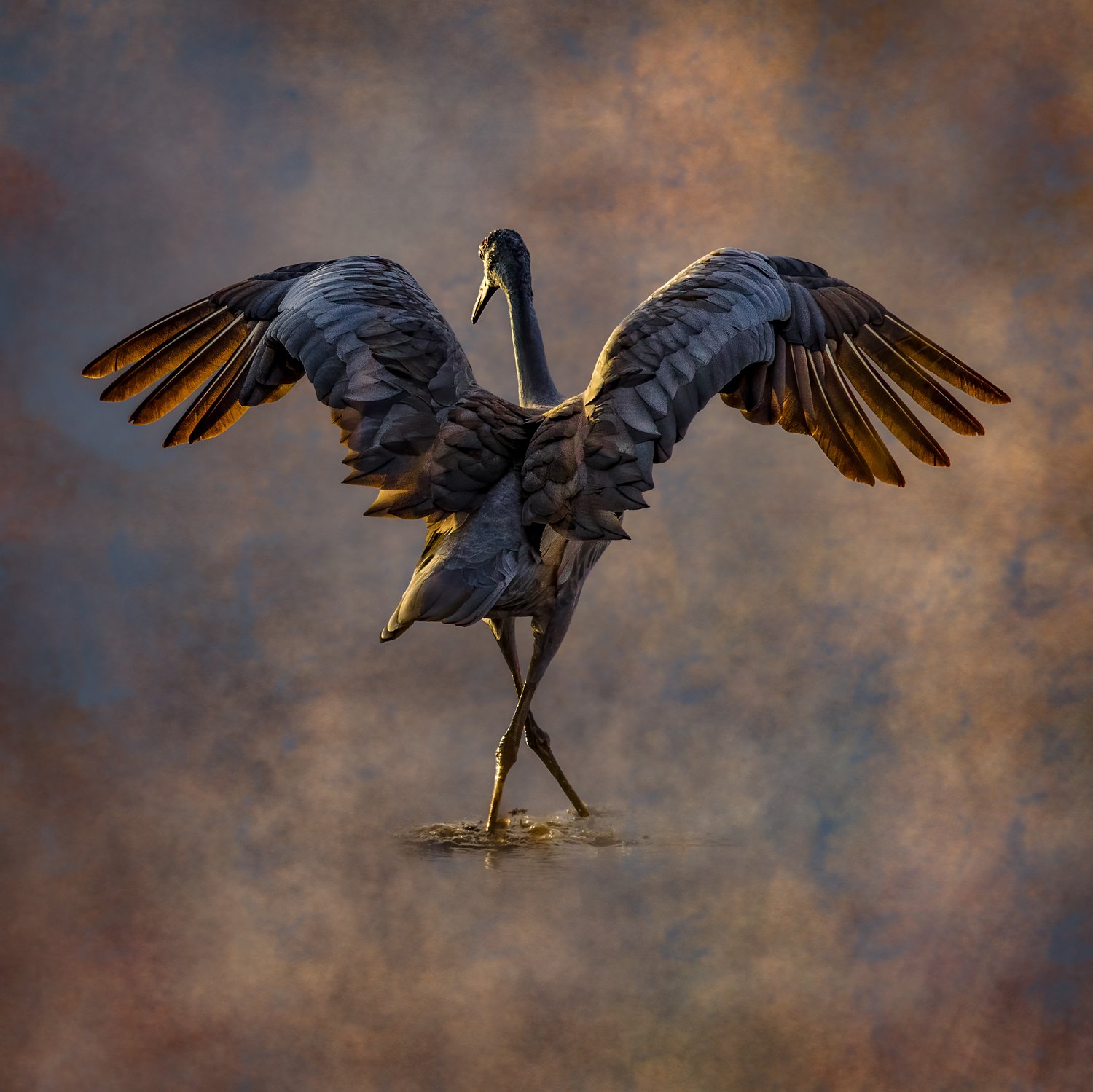 - Notes from the Artist: At heart, I have always been an artist. Through art, I can express what I see and feel as I take in the tiny details of a flower, or the majesty of a mountain range. Photography helps me become a part of the world’s beauty, and it teaches me patience as I wait for the perfect shift of light, or for a heron to snap up its dinner. In a way, photography chose me as much as I chose it. In this image, a sandhill crane, among the most elegant, graceful, as well as oldest-living bird species, symbolizes tranquility to me. It caught my eye with its regal stance just after a sunset landing, bringing to mind a prima ballerina spreading her arms while taking a bow to an appreciative audience.