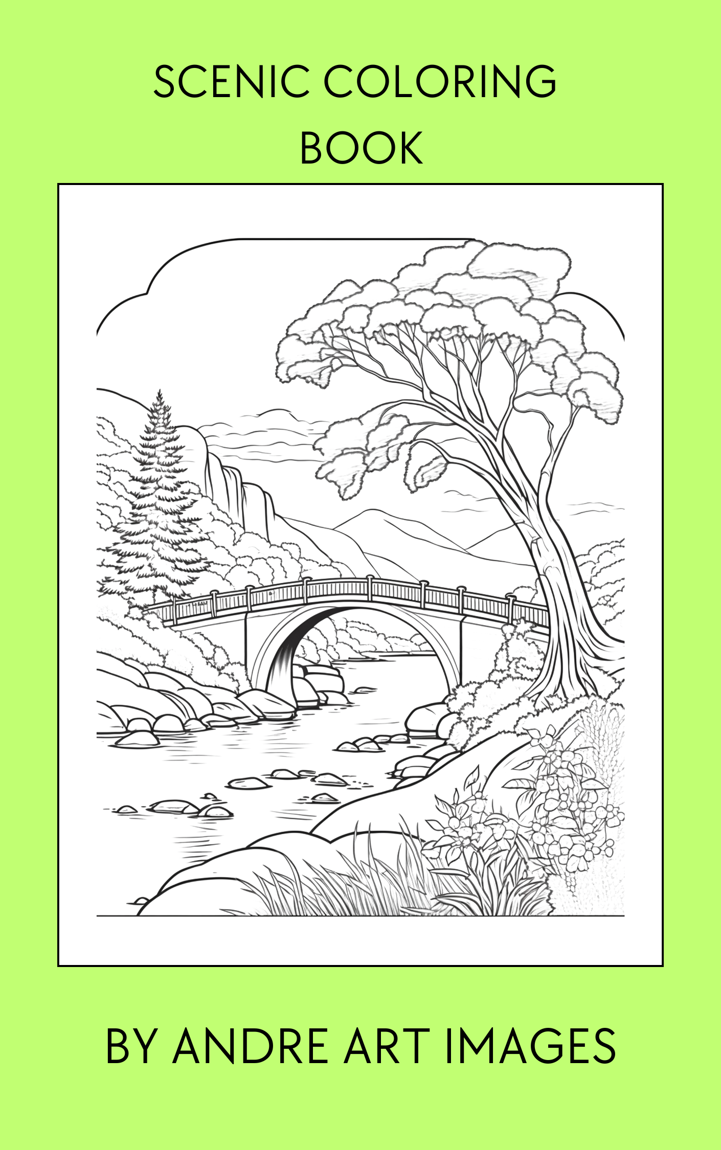 Step into a world of peaceful escapes with our Scenic Coloring Book, filled with graceful bridges, winding streams, inviting pathways, lush plants, and majestic mountains. Each page is a tranquil landscape waiting for your creativity to bring it to life.